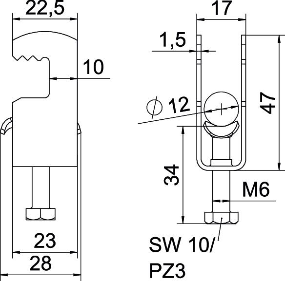 Clamping range D, max. 12 mm Clamping range D, min. 8 mm CO2 Footprint (GWP) Cradle-to-Gate 0,0941 kg CO2e / 1 Piece Dimension 08-12mm Dimension A 22,5 mm Dimension B 17 mm Dimension C 28 mm Dimension G (mm) M6 Dimension H 47 mm Dimension L 34 mm Dimension t 1,5 mm For pipe diameter, max. 12 mm For pipe diameter, min. 8 mm Halogen-free yes Height 47 mm Length 22,5 mm Length of external dimensions 28 mm Material Steel Material addition Steel Material of trough Steel Max. Tightening torque 3 Nm Mounting type Flat profile Number of cables/pipes 1 Plate thickness 1,5 mm Slot width 10 mm Surface Hot-dip galvanised Surface addition hot galvanised Thread M6 Width 17 mm With counter-trough no With metal trough yes - All types