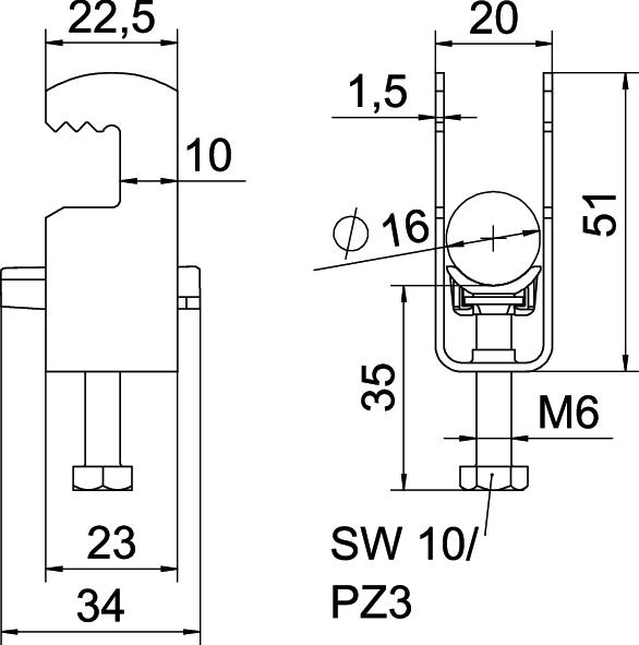 Clamping range D, max. 16 mm Clamping range D, min. 12 mm CO2 Footprint (GWP) Cradle-to-Gate 0,0898 kg CO2e / 1 Piece Dimension 12-16mm Dimension A 22,5 mm Dimension B 20 mm Dimension C 34 mm Dimension G (mm) M6 Dimension H 51 mm Dimension L 35 mm Dimension t 1,5 mm For pipe diameter, max. 16 mm For pipe diameter, min. 12 mm Halogen-free yes Height 51 mm Length 22,5 mm Length of external dimensions 34 mm Material Steel Material addition Steel Material of trough Plastic Material quality of trough Polypropylene Max. Tightening torque 3 Nm Mounting type Flat profile Number of cables/pipes 1 Plate thickness 1,5 mm Slot width 10 mm Surface Hot-dip galvanised Surface addition hot galvanised Thread M6 Width 20 mm With counter-trough no With plastic trough yes - All types