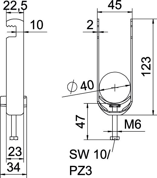 Clamping range D, max. 40 mm Clamping range D, min. 34 mm CO2 Footprint (GWP) Cradle-to-Gate 0,3033 kg CO2e / 1 Piece Dimension 34-40mm Dimension A 22,5 mm Dimension B 45 mm Dimension C 34 mm Dimension G (mm) M6 Dimension H 123 mm Dimension L 47 mm Dimension t 2 mm For pipe diameter, max. 40 mm For pipe diameter, min. 34 mm Halogen-free yes Height 123 mm Length 22,5 mm Length of external dimensions 34 mm Material Steel Material addition Steel Material of trough Plastic Material quality of trough Polypropylene Max. Tightening torque 3 Nm Mounting type Flat profile Number of cables/pipes 2 Plate thickness 2 mm Slot width 10 mm Surface Hot-dip galvanised Surface addition hot galvanised Thread M6 Width 45 mm With counter-trough no With plastic trough yes - All types