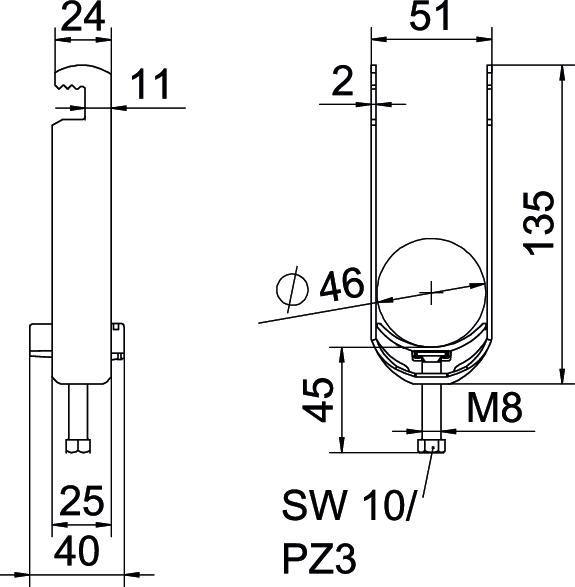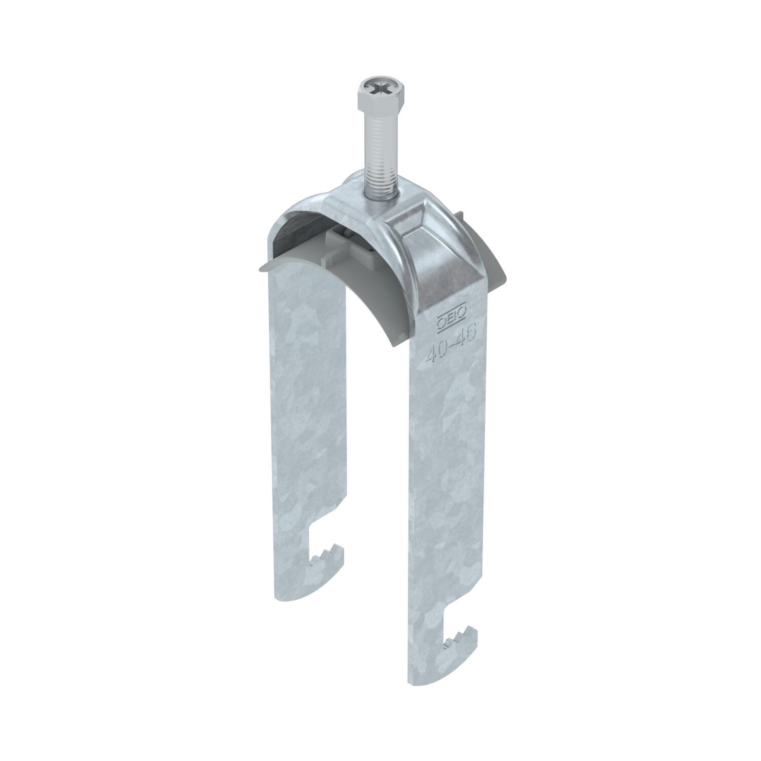 Clamping range D, max. 46 mm Clamping range D, min. 40 mm CO2 Footprint (GWP) Cradle-to-Gate 0,3754 kg CO2e / 1 Piece Dimension 40-46mm Dimension A 25 mm Dimension B 51 mm Dimension C 40 mm Dimension G (mm) M8 Dimension H 135 mm Dimension L 45 mm Dimension t 2 mm For pipe diameter, max. 46 mm For pipe diameter, min. 40 mm Halogen-free yes Height 135 mm Length 25 mm Length of external dimensions 40 mm Material Steel Material addition Steel Material of trough Plastic Material quality of trough Polypropylene Max. Tightening torque 5 Nm Mounting type Flat profile Number of cables/pipes 2 Plate thickness 2 mm Slot width 10 mm Surface Hot-dip galvanised Surface addition hot galvanised Thread M8 Width 51 mm With counter-trough no With plastic trough yes - All types