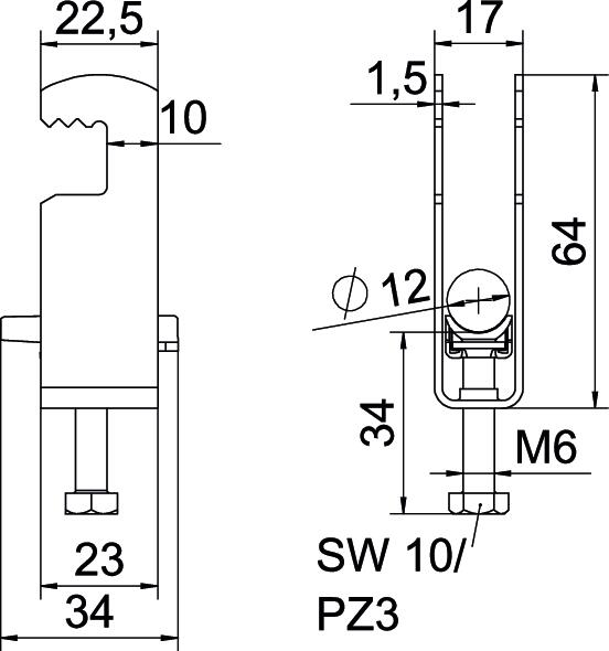 Clamping range D, max. 12 mm Clamping range D, min. 8 mm CO2 Footprint (GWP) Cradle-to-Gate 0,1332 kg CO2e / 1 Piece Dimension 08-12mm Dimension A 22,5 mm Dimension B 17 mm Dimension C 34 mm Dimension G (mm) M6 Dimension H 64 mm Dimension L 35 mm Dimension t 1,5 mm For pipe diameter, max. 12 mm For pipe diameter, min. 8 mm Halogen-free yes Height 64 mm Length 22,5 mm Length of external dimensions 34 mm Material Steel Material addition Steel Material of trough Plastic Material quality of trough Polypropylene Max. Tightening torque 3 Nm Mounting type Flat profile Number of cables/pipes 2 Plate thickness 1,5 mm Slot width 10 mm Surface Hot-dip galvanised Surface addition hot galvanised Thread M6 Width 17 mm With counter-trough no With plastic trough yes - All types
