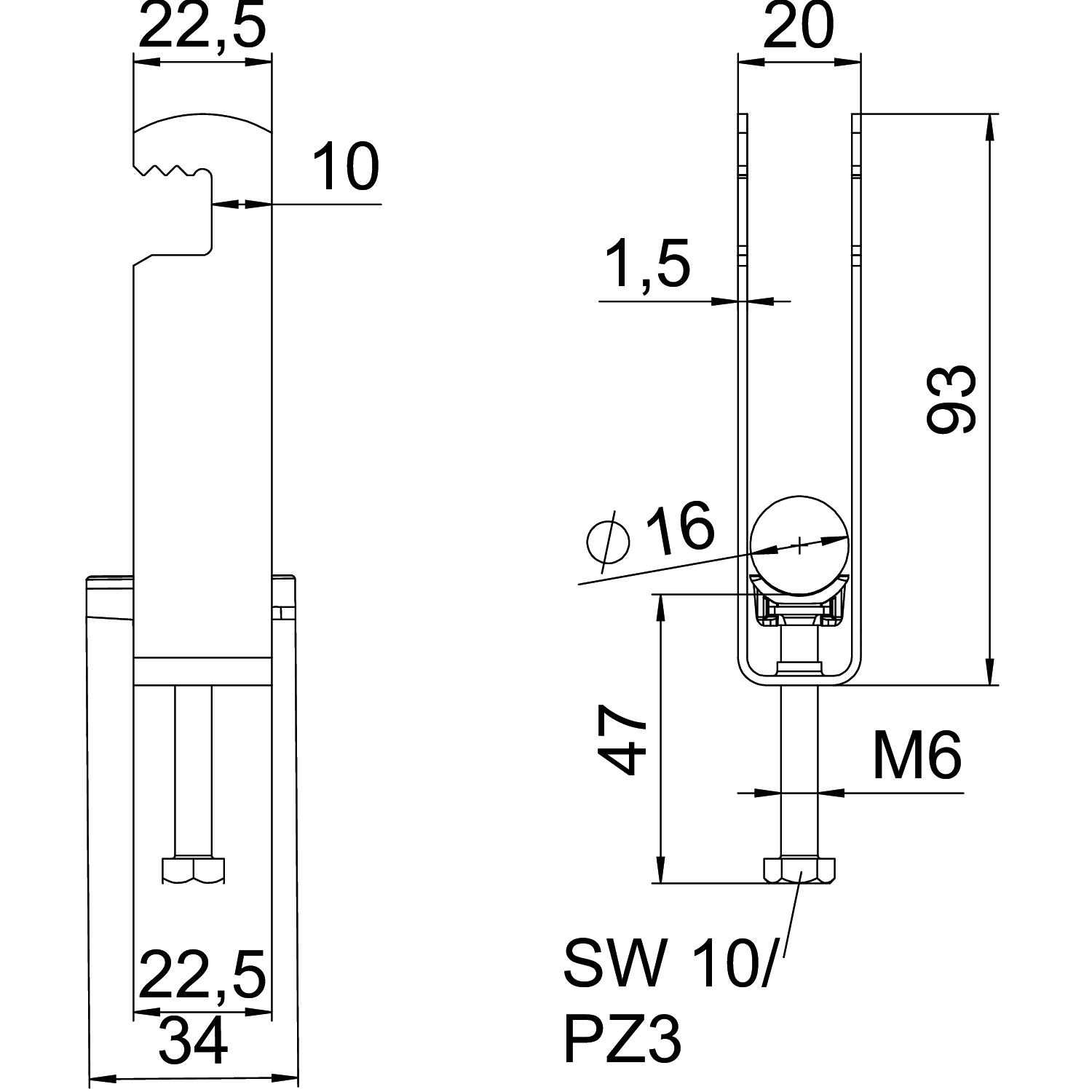 Clamping range D, max. 16 mm Clamping range D, min. 12 mm CO2 Footprint (GWP) Cradle-to-Gate 0,1819 kg CO2e / 1 Piece Dimension 12-16mm Dimension A 22,5 mm Dimension B 20 mm Dimension C 34 mm Dimension G (mm) M6 Dimension H 93 mm Dimension L 47 mm Dimension t 1,5 mm For pipe diameter, max. 16 mm For pipe diameter, min. 12 mm Halogen-free yes Height 93 mm Length 22,5 mm Length of external dimensions 34 mm Material Steel Material addition Steel Max. Tightening torque 3 Nm Mounting type Flat profile Number of cables/pipes 3 Plate thickness 1,5 mm Slot width 10 mm Surface Hot-dip galvanised Surface addition hot galvanised Thread M6 Width 20 mm With plastic trough yes - All types