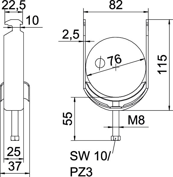 Clamping range D, max. 76 mm Clamping range D, min. 70 mm CO2 Footprint (GWP) Cradle-to-Gate 1,0191 kg CO2e / 1 Piece Dimension 70-76mm Dimension A 25 mm Dimension B 82 mm Dimension C 37 mm Dimension G (mm) M8 Dimension H 115 mm Dimension L 55 mm Dimension t 2,5 mm For pipe diameter, max. 76 mm For pipe diameter, min. 70 mm for rail with slot width (with interval), max. 17 mm for rail with slot width (with interval), min. 16 mm Halogen-free yes Height 115 mm Length 25 mm Length of external dimensions 37 mm Maintain electrical functions yes Material Stainless steel 1.4301 Material addition Rustproof steel Material of trough Rustproof steel Material quality of trough Stainless steel 304 (1.4301) Max. Tightening torque 5 Nm Mounting type Profile rail Number of cables/pipes 1 Plate thickness 2,5 mm Slot width 10 mm Surface Bright, treated Surface addition Untreated Thread M8 Width 82 mm With counter-trough no With metal trough yes With plastic trough no - All types
