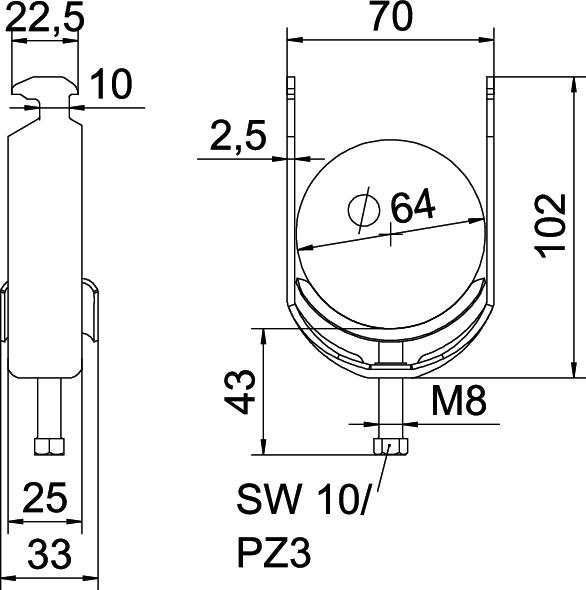 Clamping range D, max. 64 mm Clamping range D, min. 58 mm CO2 Footprint (GWP) Cradle-to-Gate 0,3627 kg CO2e / 1 Piece Dimension 58-64mm Dimension A 25 mm Dimension B 70 mm Dimension C 33 mm Dimension G (mm) M8 Dimension H 102 mm Dimension L 43 mm Dimension t 2,5 mm For pipe diameter, max. 64 mm For pipe diameter, min. 58 mm for rail with slot width (with interval), max. 17 mm for rail with slot width (with interval), min. 16 mm Halogen-free yes Height 102 mm Length 25 mm Length of external dimensions 33 mm Maintain electrical functions yes Material Steel Material addition Steel Material of trough Steel Max. Tightening torque 5 Nm Mounting type Profile rail Number of cables/pipes 1 Plate thickness 2,5 mm Slot width 10 mm Surface Hot-dip galvanised Surface addition hot galvanised Thread M8 Width 70 mm With counter-trough no With metal trough yes With plastic trough no - All types