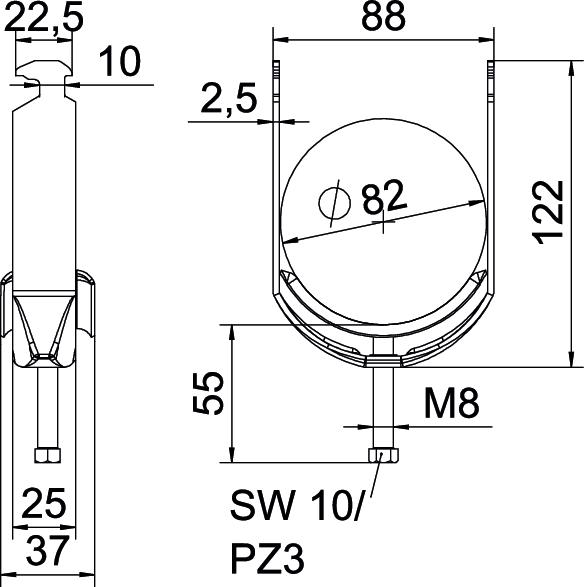 Clamping range D, max. 82 mm Clamping range D, min. 76 mm CO2 Footprint (GWP) Cradle-to-Gate 0,5519 kg CO2e / 1 Piece Dimension 76-82mm Dimension A 25 mm Dimension B 88 mm Dimension C 37 mm Dimension G (mm) M8 Dimension H 122 mm Dimension L 55 mm Dimension t 2,5 mm For pipe diameter, max. 82 mm For pipe diameter, min. 76 mm for rail with slot width (with interval), max. 17 mm for rail with slot width (with interval), min. 16 mm Halogen-free yes Height 122 mm Length 25 mm Length of external dimensions 37 mm Maintain electrical functions yes Material Steel Material addition Steel Material of trough Steel Max. Tightening torque 5 Nm Mounting type Profile rail Number of cables/pipes 1 Plate thickness 2,5 mm Slot width 10 mm Surface Hot-dip galvanised Surface addition hot galvanised Thread M8 Width 88 mm With counter-trough no With metal trough yes With plastic trough no - All types