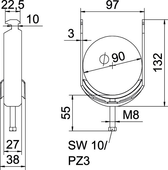 Clamping range D, max. 90 mm Clamping range D, min. 82 mm CO2 Footprint (GWP) Cradle-to-Gate 0,7187 kg CO2e / 1 Piece Dimension 82-90mm Dimension A 27 mm Dimension B 97 mm Dimension C 38 mm Dimension G (mm) M8 Dimension H 132 mm Dimension L 55 mm Dimension t 3 mm For pipe diameter, max. 90 mm For pipe diameter, min. 82 mm for rail with slot width (with interval), max. 17 mm for rail with slot width (with interval), min. 16 mm Halogen-free yes Height 132 mm Length 27 mm Length of external dimensions 38 mm Maintain electrical functions yes Material Steel Material addition Steel Material of trough Steel Max. Tightening torque 5 Nm Mounting type Profile rail Number of cables/pipes 1 Plate thickness 3 mm Slot width 10 mm Surface Hot-dip galvanised Surface addition hot galvanised Thread M8 Width 97 mm With counter-trough no With metal trough yes With plastic trough no - All types