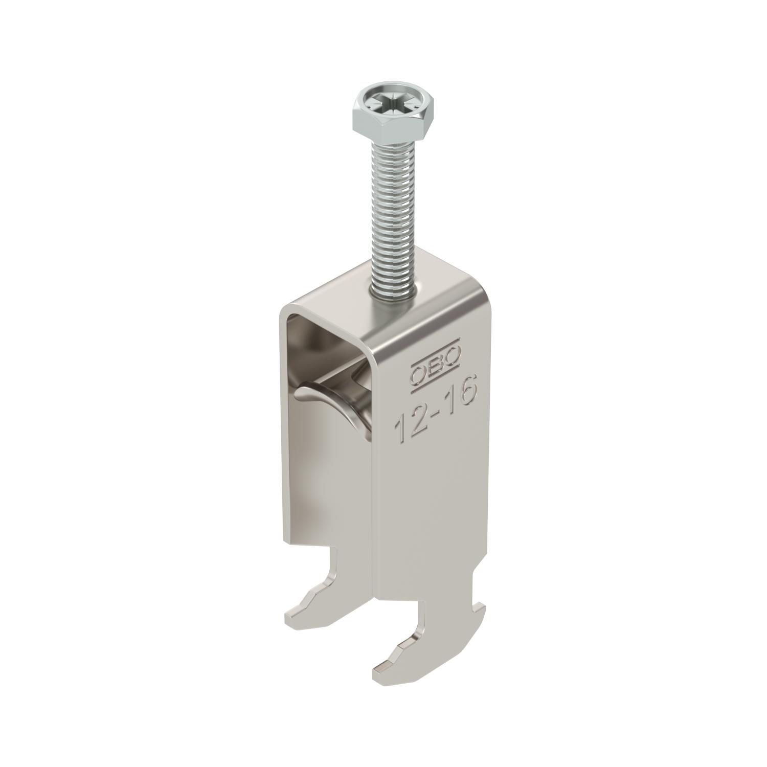 Product descriptionClamp clip with hammerhead foot, metal pressure sleeve with rounded edges to protect the cable. For vertical and horizontal mounting of 2 single cables on a C-profile rail. For a slot width 16–17 mm. With 1-start screw thread on pressure sleeve, universal hexagonal screw head WAF10, with slot and cross recess. Suitable for assembly indoors and outdoors. Multiple cables should be separated by double sleeves. We recommend the use of a counter-sleeve.