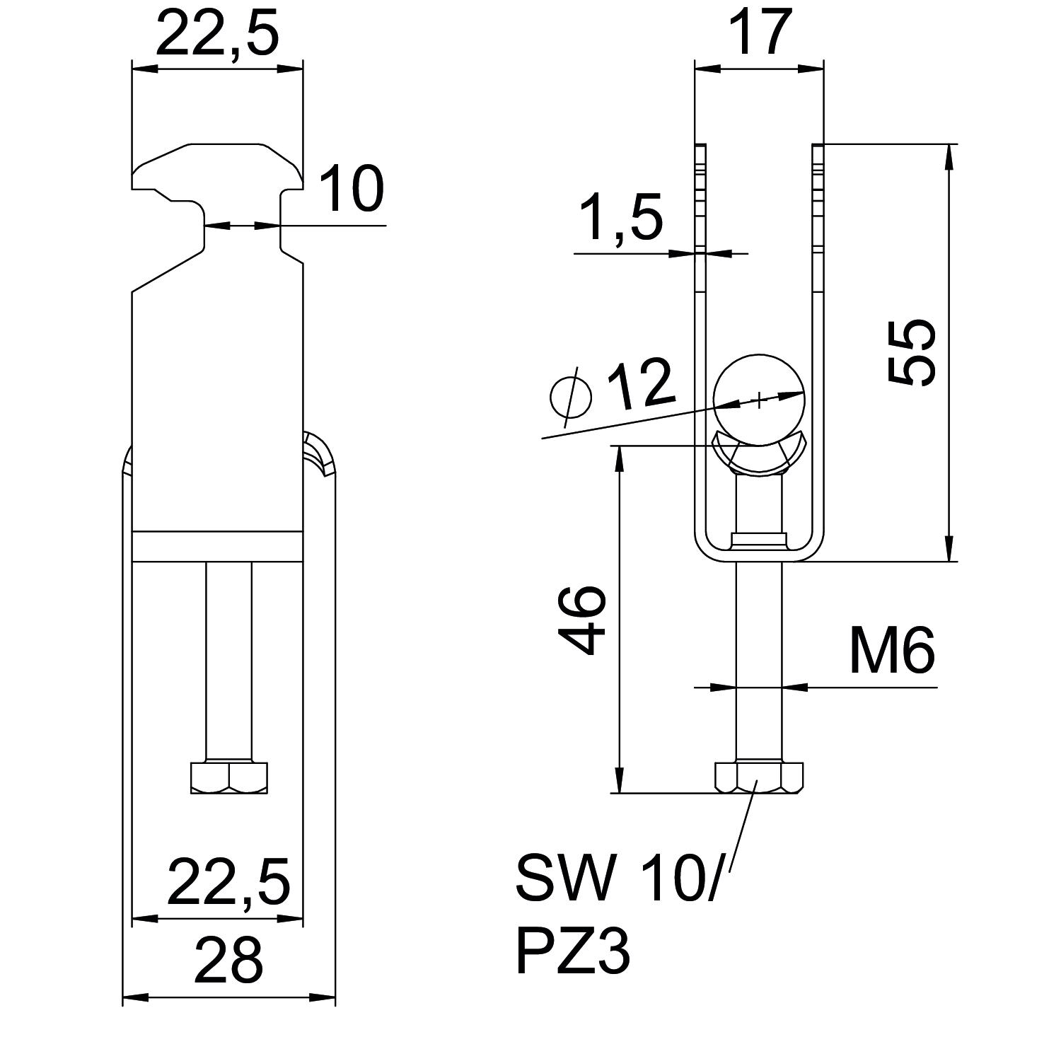 Clamping range D, max. 12 mm Clamping range D, min. 8 mm CO2 Footprint (GWP) Cradle-to-Gate 0,2958 kg CO2e / 1 Piece Dimension 08-12mm Dimension A 22,5 mm Dimension B 17 mm Dimension C 28 mm Dimension G (mm) M6 Dimension H 55 mm Dimension L 46 mm Dimension t 1,5 mm For pipe diameter, max. 12 mm For pipe diameter, min. 8 mm for rail with slot width (with interval), max. 17 mm for rail with slot width (with interval), min. 16 mm Halogen-free yes Height 55 mm Length 22,5 mm Length of external dimensions 28 mm Material Stainless steel 1.4301 Material addition Rustproof steel Material of trough Rustproof steel Material quality of trough Stainless steel 304 (1.4301) Max. Tightening torque 3 Nm Mounting type Profile rail Number of cables/pipes 2 Plate thickness 1,5 mm Slot width 10 mm Surface Bright, treated Surface addition Untreated Thread M6 Width 17 mm With counter-trough no With metal trough yes With plastic trough no - All types