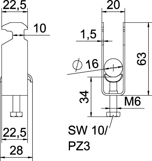 Clamping range D, max. 16 mm Clamping range D, min. 12 mm CO2 Footprint (GWP) Cradle-to-Gate 0,1208 kg CO2e / 1 Piece Dimension 12-16mm Dimension A 22,5 mm Dimension B 20 mm Dimension C 28 mm Dimension G (mm) M6 Dimension H 63 mm Dimension L 34 mm Dimension t 1,5 mm For pipe diameter, max. 16 mm For pipe diameter, min. 12 mm for rail with slot width (with interval), max. 17 mm for rail with slot width (with interval), min. 16 mm Halogen-free yes Height 63 mm Length 22,5 mm Length of external dimensions 28 mm Maintain electrical functions yes Material Steel Material addition Steel Material of trough Steel Max. Tightening torque 3 Nm Mounting type Profile rail Number of cables/pipes 2 Plate thickness 1,5 mm Slot width 10 mm Surface Hot-dip galvanised Surface addition hot galvanised Thread M6 Width 20 mm With counter-trough no With metal trough yes With plastic trough no - All types