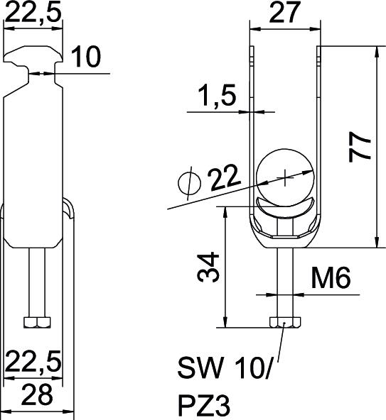 Clamping range D, max. 22 mm Clamping range D, min. 16 mm CO2 Footprint (GWP) Cradle-to-Gate 0,139 kg CO2e / 1 Piece Dimension 16-22mm Dimension A 22,5 mm Dimension B 27 mm Dimension C 28 mm Dimension G (mm) M6 Dimension H 77 mm Dimension L 34 mm Dimension t 1,5 mm For pipe diameter, max. 22 mm For pipe diameter, min. 16 mm for rail with slot width (with interval), max. 17 mm for rail with slot width (with interval), min. 16 mm Halogen-free yes Height 77 mm Length 22,5 mm Length of external dimensions 28 mm Maintain electrical functions yes Material Steel Material addition Steel Material of trough Steel Max. Tightening torque 3 Nm Mounting type Profile rail Number of cables/pipes 2 Plate thickness 1,5 mm Slot width 10 mm Surface Hot-dip galvanised Surface addition hot galvanised Thread M6 Width 27 mm With counter-trough no With metal trough yes With plastic trough no - All types