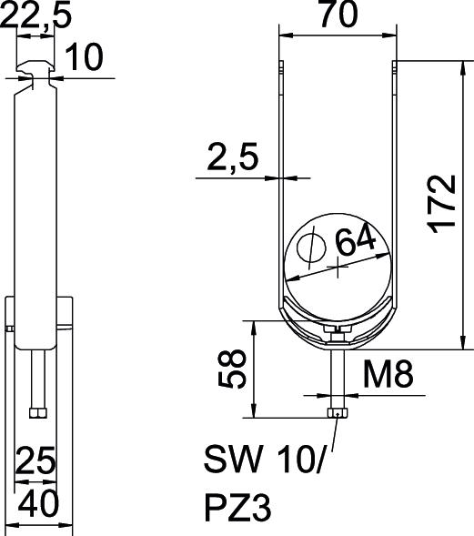 Clamping range D, max. 64 mm Clamping range D, min. 58 mm CO2 Footprint (GWP) Cradle-to-Gate 1,0819 kg CO2e / 1 Piece Dimension 58-64mm Dimension A 25 mm Dimension B 70 mm Dimension C 40 mm Dimension G (mm) M8 Dimension H 172 mm Dimension L 58 mm Dimension t 2,5 mm For pipe diameter, max. 64 mm For pipe diameter, min. 58 mm for rail with slot width (with interval), max. 17 mm for rail with slot width (with interval), min. 16 mm Halogen-free yes Height 172 mm Length 25 mm Length of external dimensions 40 mm Material Stainless steel 1.4301 Material addition Rustproof steel Material of trough Plastic Material quality of trough Polypropylene Max. Tightening torque 5 Nm Mounting type Profile rail Number of cables/pipes 2 Plate thickness 2,5 mm Slot width 10 mm Surface Bright, treated Surface addition Untreated Thread M8 Width 70 mm With counter-trough no With plastic trough yes - All types