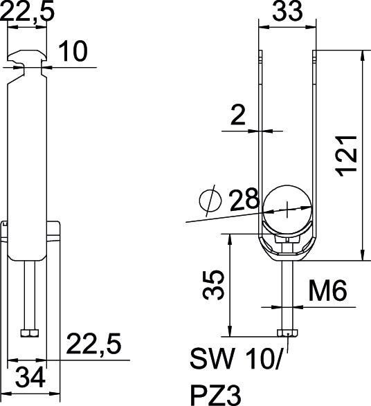 Clamping range D, max. 28 mm Clamping range D, min. 22 mm CO2 Footprint (GWP) Cradle-to-Gate 0,4862 kg CO2e / 1 Piece Dimension 22-28mm Dimension A 22,5 mm Dimension B 33 mm Dimension C 34 mm Dimension G (mm) M6 Dimension H 121 mm Dimension L 59 mm Dimension t 2 mm For pipe diameter, max. 28 mm For pipe diameter, min. 22 mm for rail with slot width (with interval), max. 17 mm for rail with slot width (with interval), min. 16 mm Halogen-free yes Height 121 mm Length 22,5 mm Length of external dimensions 34 mm Material Aluminium Material addition Aluminium Material of trough Plastic Material quality of trough Polypropylene Max. Tightening torque 2 Nm Mounting type Profile rail Number of cables/pipes 3 Plate thickness 2 mm Slot width 10 mm Surface addition Untreated Thread M6 Width 33 mm With counter-trough no With plastic trough yes - All types