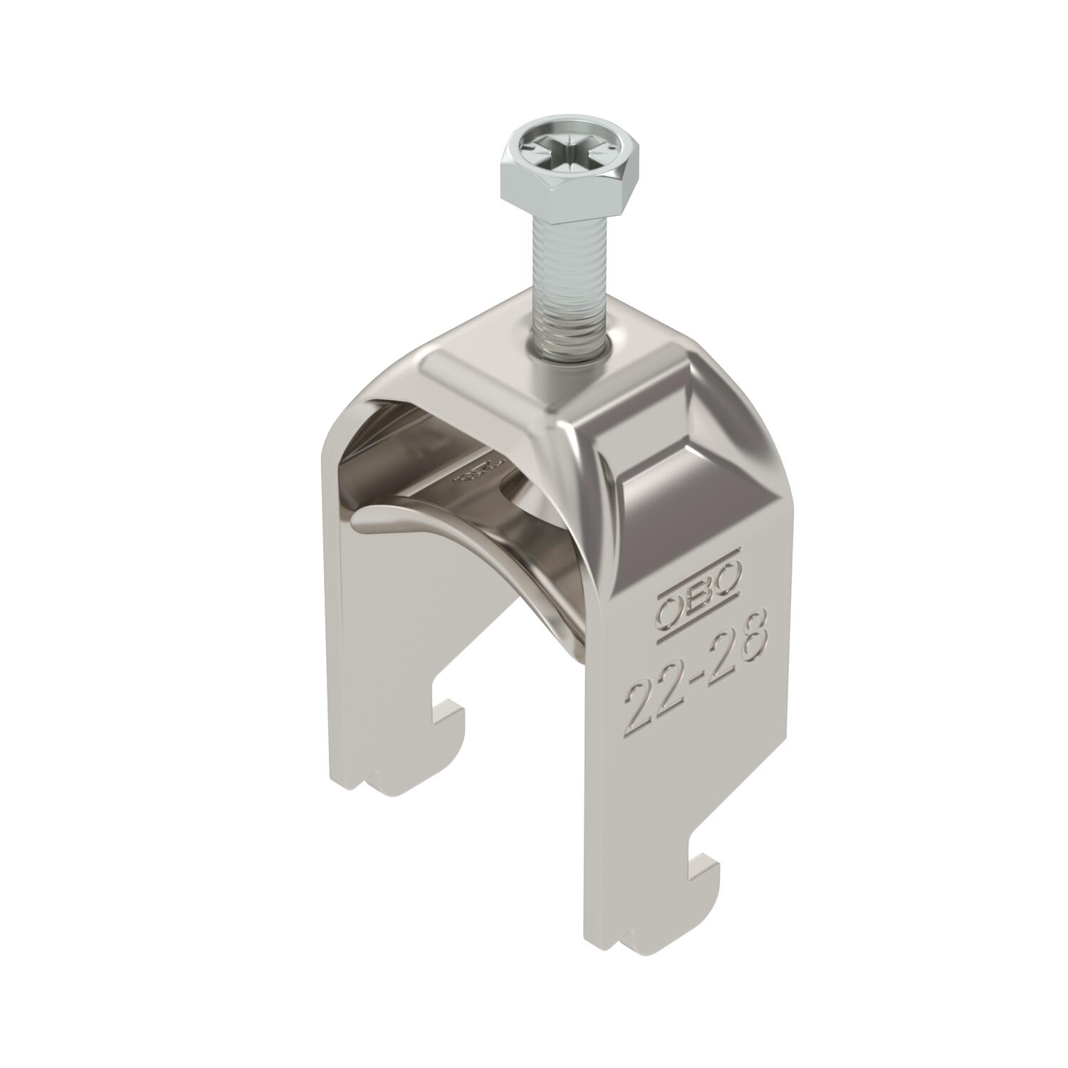 Product descriptionClamp clip with N-foot, metal pressure sleeve with rounded edges to protect the cable. For vertical and horizontal mounting of 1 single cable on a C-profile rail. For slot width 11‒12 mm With 1-start screw thread on pressure sleeve, universal hexagonal screw head WAF10, with slot and cross recess. Suitable for assembly indoors and outdoors. We recommend the use of a counter-sleeve.