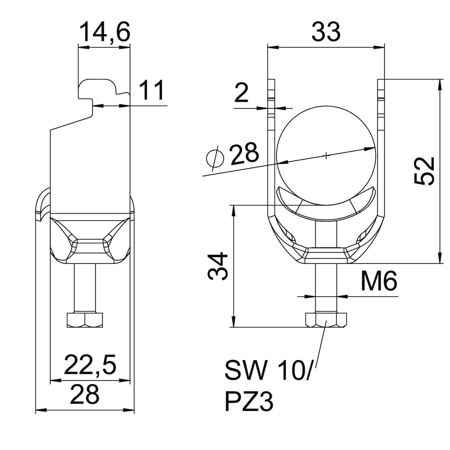Clamping range D, max. 28 mm Clamping range D, min. 22 mm CO2 Footprint (GWP) Cradle-to-Gate 0,3654 kg CO2e / 1 Piece Dimension 22-28mm Dimension A 22,5 mm Dimension B 33 mm Dimension C 28 mm Dimension G (mm) M6 Dimension H 52 mm Dimension L 34 mm Dimension t 2 mm For pipe diameter, max. 28 mm For pipe diameter, min. 22 mm for rail with slot width (with interval), max. 12 mm for rail with slot width (with interval), min. 11 mm Halogen-free yes Height 52 mm Length 22,5 mm Length of external dimensions 28 mm Material Stainless steel 1.4301 Material addition Rustproof steel Max. Tightening torque 3 Nm Mounting type Profile rail Number of cables/pipes 1 Plate thickness 2 mm Slot width 10 mm Surface Bright, treated Surface addition Untreated Thread M6 Width 33 mm With metal trough yes With plastic trough no - All types