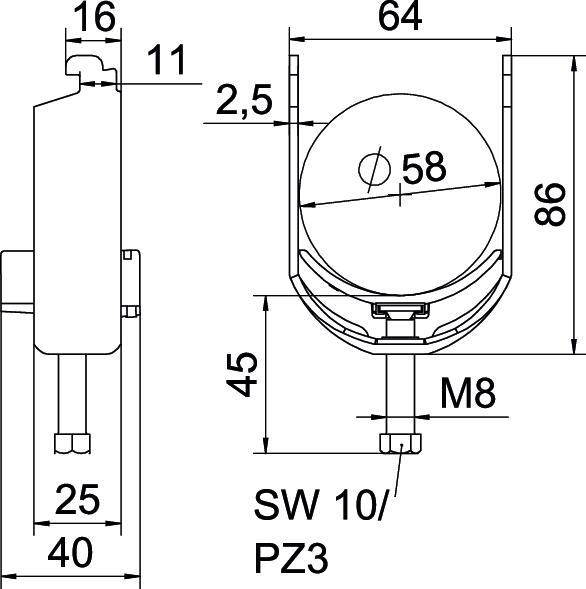 Clamping range D, max. 58 mm Clamping range D, min. 52 mm CO2 Footprint (GWP) Cradle-to-Gate 0,2721 kg CO2e / 1 Piece Dimension 52-58mm Dimension A 25 mm Dimension B 64 mm Dimension C 40 mm Dimension G (mm) M8 Dimension H 86 mm Dimension L 45 mm Dimension t 2,5 mm For pipe diameter, max. 58 mm For pipe diameter, min. 52 mm for rail with slot width (with interval), max. 12 mm for rail with slot width (with interval), min. 11 mm Halogen-free yes Height 86 mm Length 25 mm Length of external dimensions 40 mm Material Steel Material addition Steel Material of trough Plastic Material quality of trough Polypropylene Max. Tightening torque 5 Nm Mounting type Profile rail Number of cables/pipes 1 Plate thickness 2,5 mm Slot width 10 mm Surface Hot-dip galvanised Surface addition hot galvanised Thread M8 Width 64 mm With counter-trough no With plastic trough yes - All types