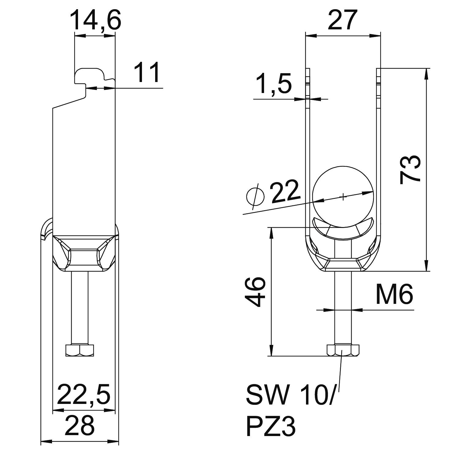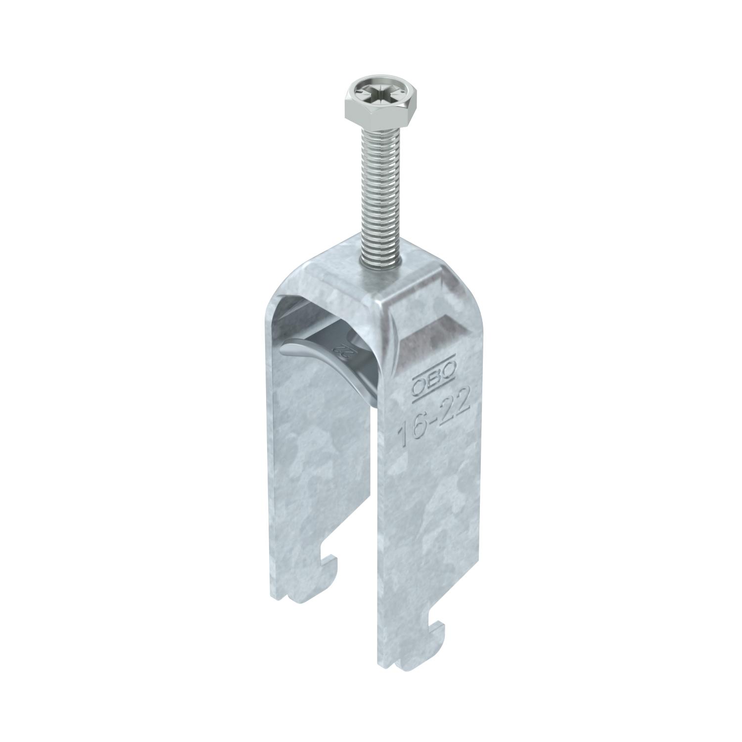 Clamping range D, max. 22 mm Clamping range D, min. 16 mm CO2 Footprint (GWP) Cradle-to-Gate 0,147 kg CO2e / 1 Piece Dimension 16-22mm Dimension A 22,5 mm Dimension B 27 mm Dimension C 28 mm Dimension G (mm) M6 Dimension H 72 mm Dimension L 46 mm Dimension t 1,5 mm For pipe diameter, max. 22 mm For pipe diameter, min. 16 mm for rail with slot width (with interval), max. 12 mm for rail with slot width (with interval), min. 11 mm Halogen-free yes Height 72 mm Length 22,5 mm Length of external dimensions 28 mm Material Steel Material addition Steel Material of trough Steel Max. Tightening torque 3 Nm Mounting type Profile rail Number of cables/pipes 2 Plate thickness 1,5 mm Slot width 10 mm Surface Hot-dip galvanised Surface addition hot galvanised Thread M6 Width 27 mm With counter-trough no With metal trough yes With plastic trough no - All types