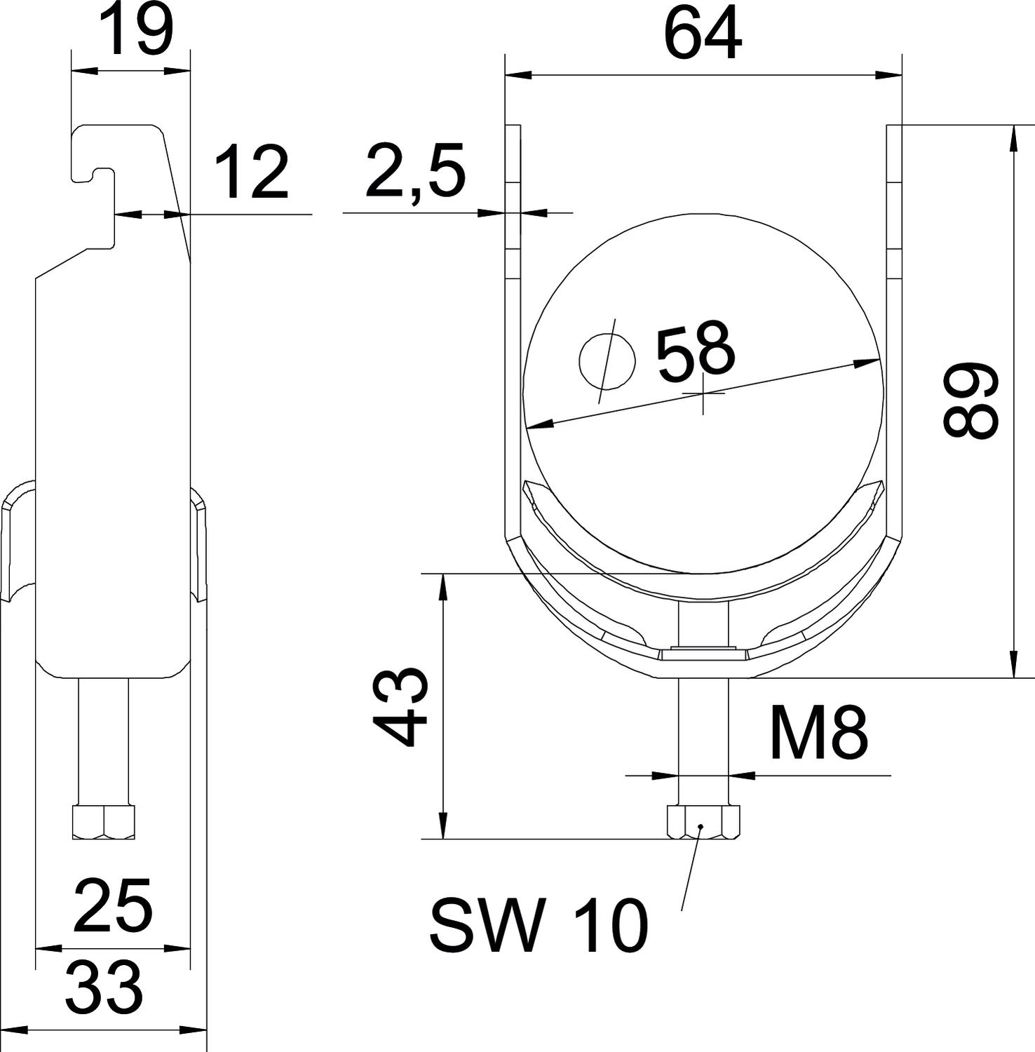 Clamping range D, max. 58 mm Clamping range D, min. 52 mm CO2 Footprint (GWP) Cradle-to-Gate 0,3232 kg CO2e / 1 Piece Dimension 52-58mm Dimension A 25 mm Dimension B 64 mm Dimension C 33 mm Dimension G (mm) M8 Dimension H 89 mm Dimension L 43 mm Dimension t 2,5 mm For pipe diameter, max. 58 mm For pipe diameter, min. 52 mm for rail with slot width (with interval), max. 22 mm for rail with slot width (with interval), min. 18 mm Halogen-free yes Height 89 mm Length 25 mm Length of external dimensions 33 mm Maintain electrical functions yes Material Steel Material addition Steel Material of trough Steel Max. Tightening torque 5 Nm Mounting type Profile rail Number of cables/pipes 1 Plate thickness 2,5 mm Slot width 10 mm Surface Hot-dip galvanised Surface addition hot galvanised Thread M8 Width 64 mm With counter-trough no With metal trough yes - All types