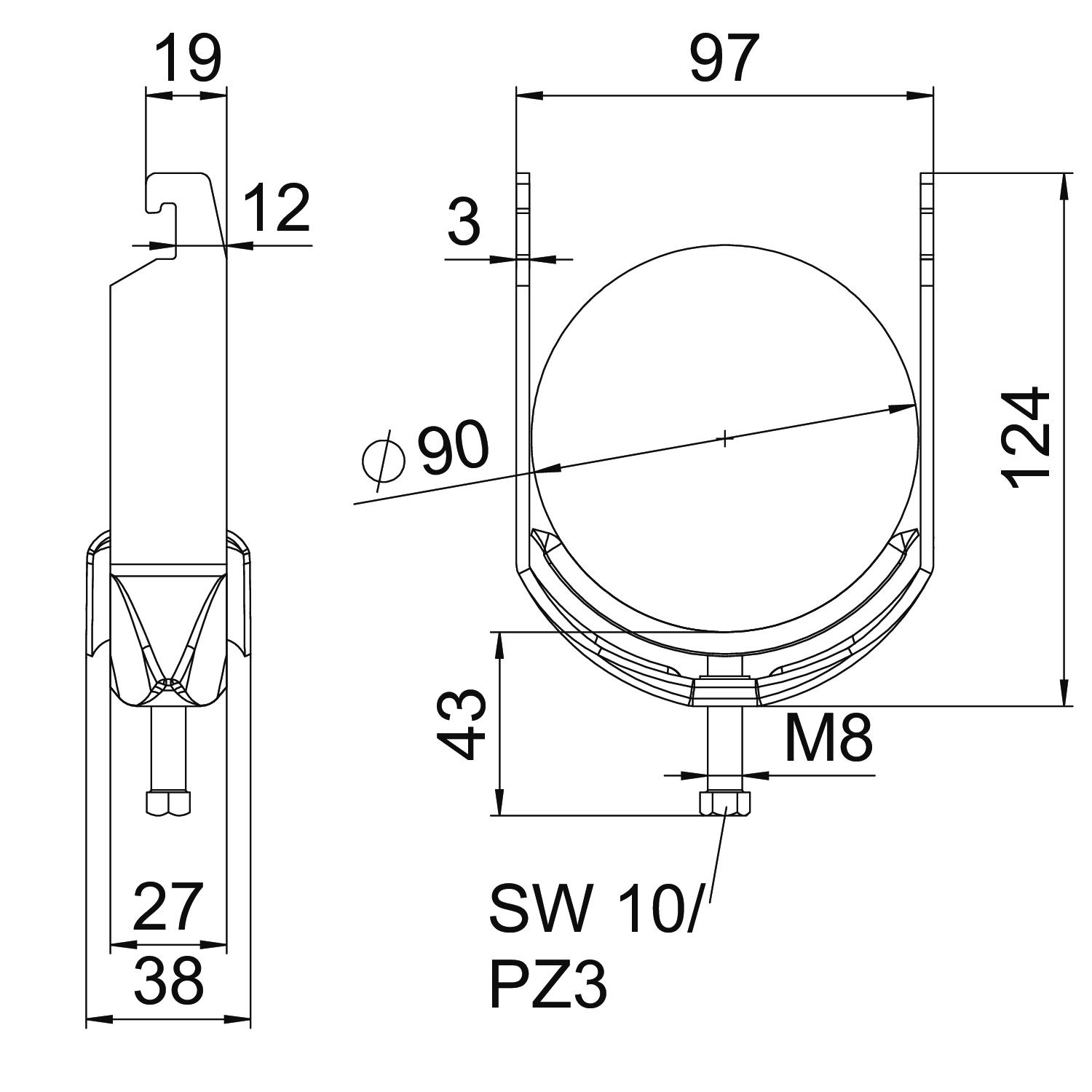 Clamping range D, max. 90 mm Clamping range D, min. 82 mm CO2 Footprint (GWP) Cradle-to-Gate 0,7018 kg CO2e / 1 Piece Dimension 82-90mm Dimension A 27 mm Dimension B 97 mm Dimension C 38 mm Dimension G (mm) M8 Dimension H 124 mm Dimension L 43 mm Dimension t 3 mm For pipe diameter, max. 90 mm For pipe diameter, min. 82 mm for rail with slot width (with interval), max. 22 mm for rail with slot width (with interval), min. 18 mm Halogen-free yes Height 124 mm Length 27 mm Length of external dimensions 38 mm Maintain electrical functions yes Material Steel Material addition Steel Material of trough Steel Max. Tightening torque 5 Nm Mounting type Profile rail Number of cables/pipes 1 Plate thickness 3 mm Slot width 10 mm Surface Hot-dip galvanised Surface addition hot galvanised Thread M8 Width 97 mm With counter-trough no With metal trough yes With plastic trough no - All types