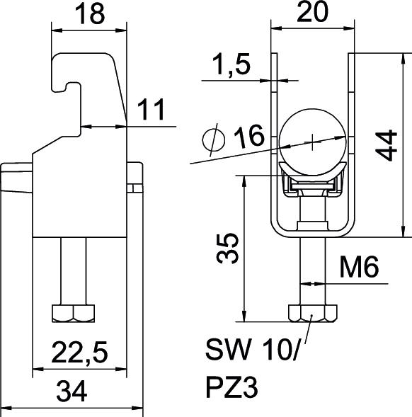 Product descriptionClamp clip with U-foot, plastic pressure sleeve made of polypropylene. For vertical and horizontal mounting of 1 single cable on a C-profile rail. For slot width 18–22 mm. With 1-start screw thread on pressure sleeve, universal hexagonal screw head WAF10, with slot and cross recess. Suitable for assembly indoors and outdoors. We recommend the use of a counter-sleeve.