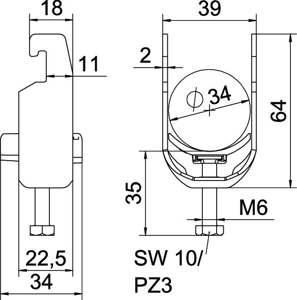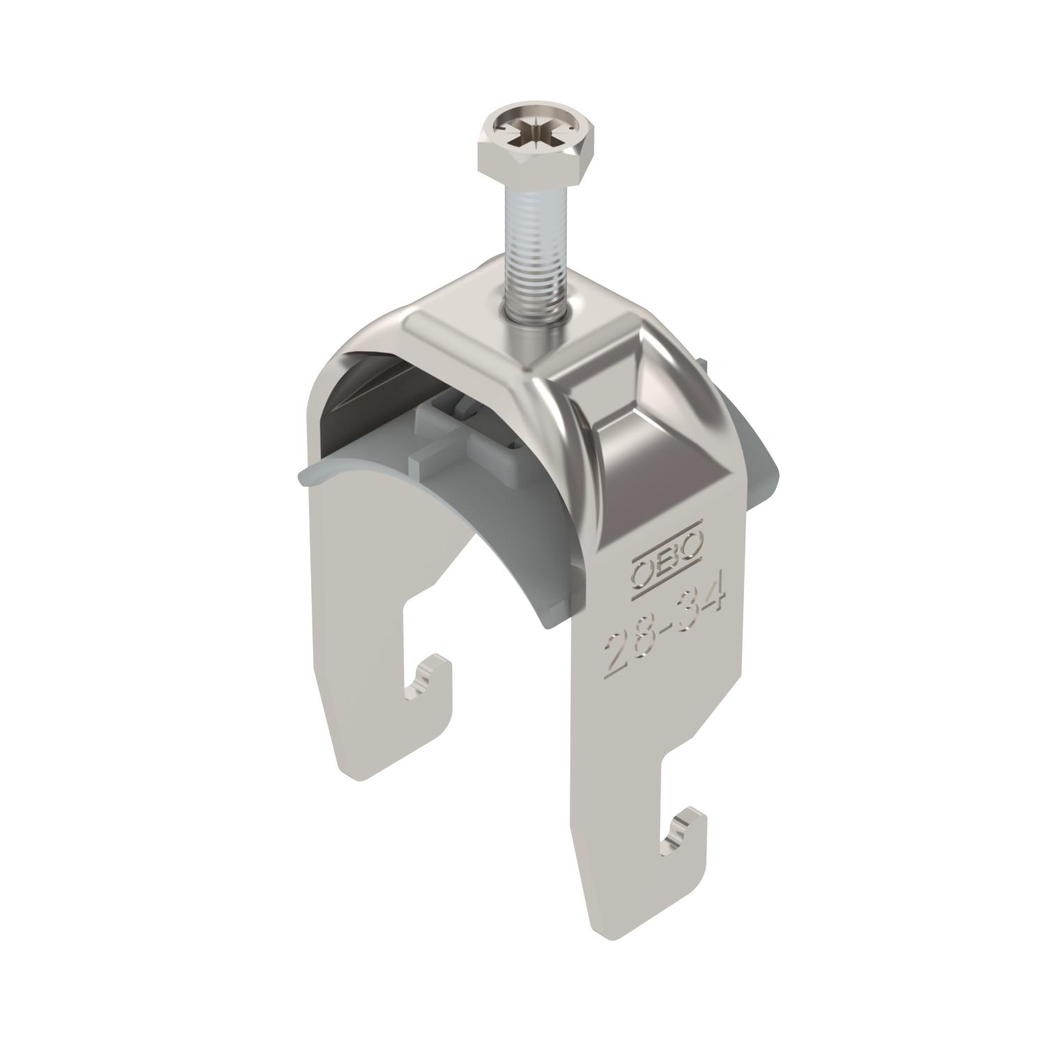 Product descriptionClamp clip with U-foot, plastic pressure sleeve made of polypropylene. For vertical and horizontal mounting of 1 single cable on a C-profile rail. For slot width 18–22 mm. With 1-start screw thread on pressure sleeve, universal hexagonal screw head WAF10, with slot and cross recess. Suitable for assembly indoors and outdoors. We recommend the use of a counter-sleeve.