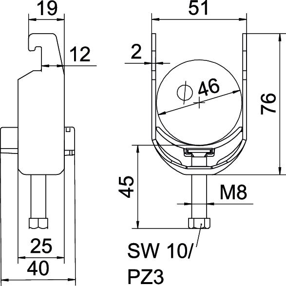 Clamping range D, max. 46 mm Clamping range D, min. 40 mm CO2 Footprint (GWP) Cradle-to-Gate 0,5116 kg CO2e / 1 Piece Dimension 40-46mm Dimension A 25 mm Dimension B 51 mm Dimension C 40 mm Dimension G (mm) M8 Dimension H 76 mm Dimension L 45 mm Dimension t 2 mm For pipe diameter, max. 46 mm For pipe diameter, min. 40 mm for rail with slot width (with interval), max. 22 mm for rail with slot width (with interval), min. 18 mm Halogen-free yes Height 76 mm Length 25 mm Length of external dimensions 40 mm Material Stainless steel 1.4301 Material addition Rustproof steel Material of trough Plastic Material quality of trough Polypropylene Max. Tightening torque 5 Nm Mounting type Profile rail Number of cables/pipes 1 Plate thickness 2 mm Slot width 10 mm Surface Bright, treated Surface addition Untreated Thread M8 Width 51 mm With counter-trough no With metal trough no With plastic trough yes - All types