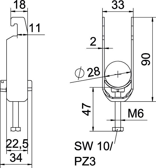 Clamping range D, max. 28 mm Clamping range D, min. 22 mm CO2 Footprint (GWP) Cradle-to-Gate 0,1801 kg CO2e / 1 Piece Dimension 22-28mm Dimension A 22,5 mm Dimension B 33 mm Dimension C 34 mm Dimension G (mm) M6 Dimension H 90 mm Dimension L 47 mm Dimension t 2 mm For pipe diameter, max. 28 mm For pipe diameter, min. 22 mm for rail with slot width (with interval), max. 22 mm for rail with slot width (with interval), min. 18 mm Halogen-free yes Height 90 mm Length 22,5 mm Length of external dimensions 34 mm Material Steel Material addition Steel Material of trough Plastic Material quality of trough Polypropylene Max. Tightening torque 3 Nm Mounting type Profile rail Number of cables/pipes 2 Plate thickness 2 mm Slot width 10 mm Surface Hot-dip galvanised Surface addition hot galvanised Thread M6 Width 33 mm With counter-trough no With plastic trough yes - All types