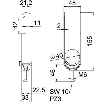 Clamping range D, max. 40 mm Clamping range D, min. 34 mm CO2 Footprint (GWP) Cradle-to-Gate 0,4183 kg CO2e / 1 Piece Dimension 34-40mm Dimension A 22,5 mm Dimension B 45 mm Dimension C 33 mm Dimension G (mm) M6 Dimension H 155 mm Dimension L 46 mm Dimension t 2 mm For pipe diameter, max. 40 mm For pipe diameter, min. 34 mm Halogen-free yes Height 155 mm Length 22,5 mm Length of external dimensions 33 mm Material Steel Material addition Steel Max. Tightening torque 3 Nm Mounting type Angle profile Number of cables/pipes 2 Plate thickness 2 mm Slot width 10 mm Surface Hot-dip galvanised Surface addition hot galvanised Thread M6 Width 45 mm With metal trough yes - All types