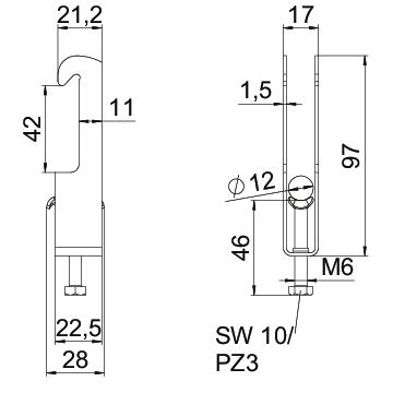 Clamping range D, max. 12 mm Clamping range D, min. 8 mm CO2 Footprint (GWP) Cradle-to-Gate 0,1887 kg CO2e / 1 Piece Dimension 8-12mm Dimension A 22,5 mm Dimension B 17 mm Dimension C 28 mm Dimension G (mm) M6 Dimension H 97 mm Dimension L 46 mm Dimension t 1,5 mm For pipe diameter, max. 12 mm For pipe diameter, min. 8 mm Halogen-free yes Height 97 mm Length 22,5 mm Length of external dimensions 28 mm Material Steel Material addition Steel Max. Tightening torque 3 Nm Mounting type Angle profile Number of cables/pipes 2 Plate thickness 1,5 mm Slot width 10 mm Surface Hot-dip galvanised Surface addition hot galvanised Thread M6 Width 17 mm With metal trough yes - All types