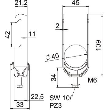 Clamping range D, max. 40 mm Clamping range D, min. 34 mm CO2 Footprint (GWP) Cradle-to-Gate 0,2288 kg CO2e / 1 Piece Dimension 34-40mm Dimension A 22,5 mm Dimension B 45 mm Dimension C 33 mm Dimension G (mm) M6 Dimension H 109 mm Dimension L 34 mm Dimension t 2 mm For pipe diameter, max. 40 mm For pipe diameter, min. 34 mm Halogen-free yes Height 109 mm Length 22,5 mm Length of external dimensions 33 mm Material Steel Material addition Steel Max. Tightening torque 3 Nm Mounting type Angle profile Number of cables/pipes 1 Plate thickness 2 mm Slot width 10 mm Surface Hot-dip galvanised Surface addition hot galvanised Thread M6 Width 45 mm With metal trough yes - All types