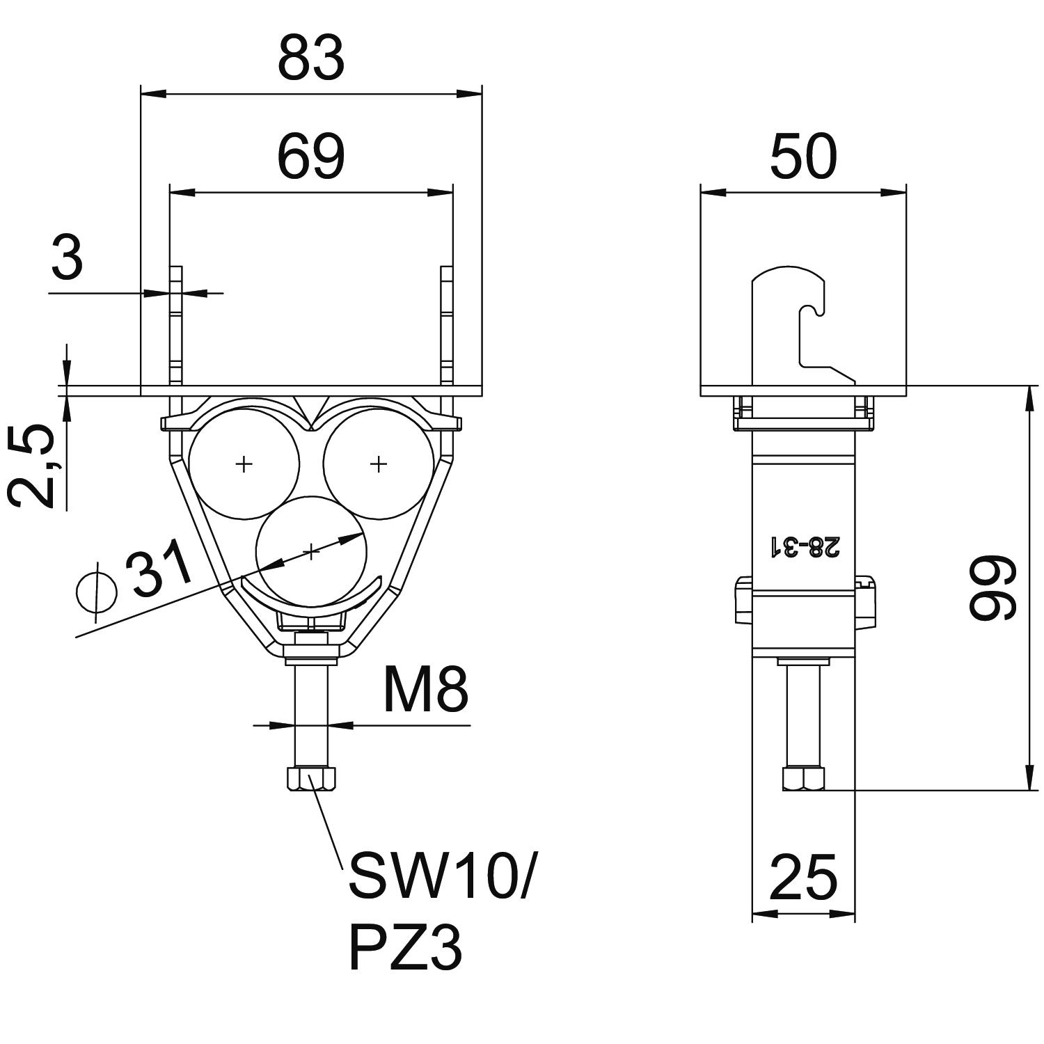 Cable diameter, max. 31 mm Cable diameter, min. 28 mm Clamping range D, max. 31 mm Clamping range D, min. 28 mm CO2 Footprint (GWP) Cradle-to-Gate 0,5367 kg CO2e / 1 Piece Dimension 28-31mm Dimension A 83 mm Dimension B 69 mm Dimension H 107 mm for rail with slot width (with interval), max. 22 mm for rail with slot width (with interval), min. 18 mm Halogen-free yes Impact-resistant no Material Steel Material addition Steel Material of counter-trough Plastic Material of trough Plastic Material quality of trough Polypropylene Max. Tightening torque 5 Nm Mounting type Profile rail Number of cables/pipes 3 Surface Hot-dip galvanised Surface addition hot galvanised With counter-trough yes With metal trough no With plastic trough yes - All types