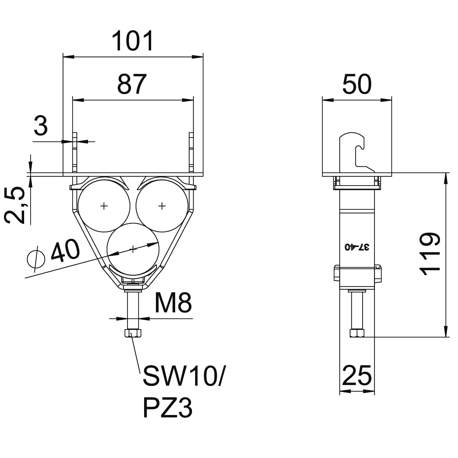 Cable diameter, max. 40 mm Cable diameter, min. 37 mm Clamping range D, max. 40 mm Clamping range D, min. 37 mm CO2 Footprint (GWP) Cradle-to-Gate 0,6662 kg CO2e / 1 Piece Dimension 37-40mm Dimension A 101 mm Dimension B 87 mm Dimension H 123 mm for rail with slot width (with interval), max. 22 mm for rail with slot width (with interval), min. 18 mm Halogen-free yes Impact-resistant no Material Steel Material addition Steel Material of counter-trough Plastic Material of trough Plastic Material quality of trough Polypropylene Max. Tightening torque 5 Nm Mounting type Profile rail Number of cables/pipes 3 Surface Hot-dip galvanised Surface addition hot galvanised With counter-trough yes With metal trough no With plastic trough yes - All types