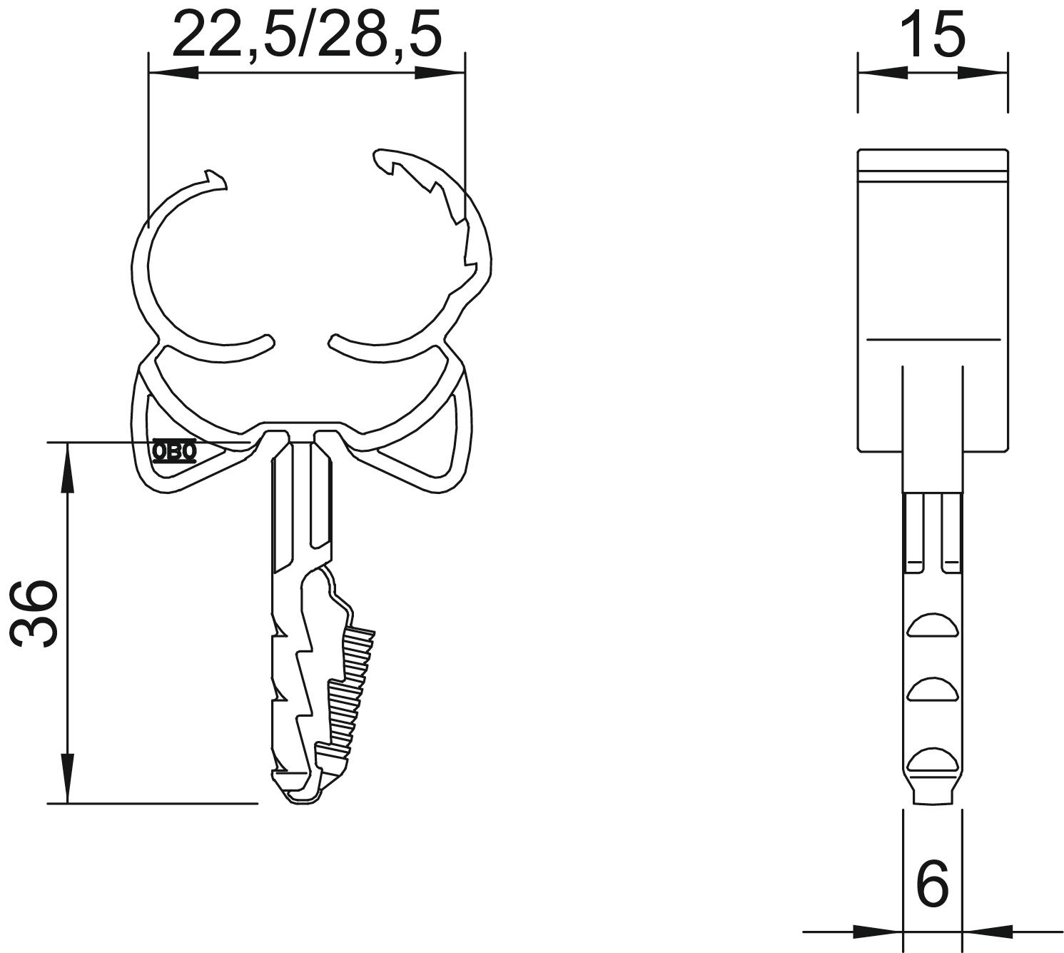Breaking load for concrete B25 500 N Clamping range D, max. 28,5 mm Clamping range D, min. 22,5 mm CO2 Footprint (GWP) Cradle-to-Gate 0,0308 kg CO2e / 1 Piece Colour Light grey; RAL 7035 Dimension 22,5-28,5mm Drill hole depth 40 mm Drill hole diameter, min. 6 mm Fastening type Plug fastening Halogen-free yes Material Polyamide Version for Closed - All types
