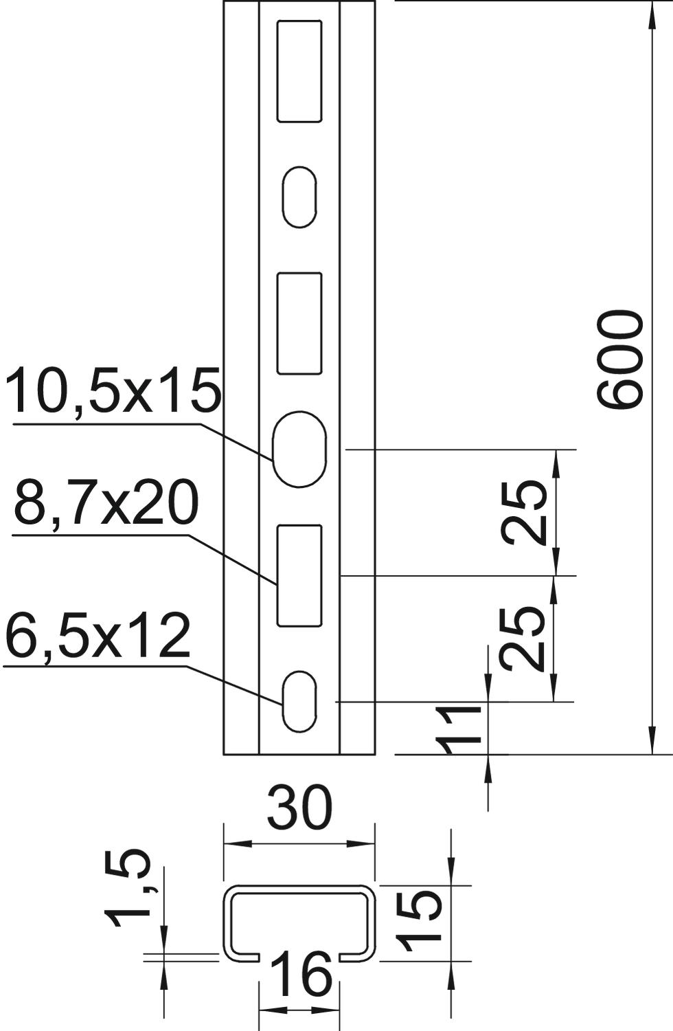 Breakable no CO2 Footprint (GWP) Cradle-to-Gate 0,981 kg CO2e / 1 Piece Dimension 600x30x15 Dimension L 600 mm Drill hole spacing, centre 25 mm Height 15 mm Length 600 mm Maintain electrical functions no Material Steel Material thickness 1,5 mm Profile shape C profile Slot width 16 mm Static value A 0,8 cm² Static value ly 0,24 cm⁴ Static value lz 1,22 cm⁴ Static value Wy 0,29 cm³ Static value Wz 0,81 cm³ Surface Hot-dip galvanised Type of perforation Perforated back Version for Single profile Width 30 mm With perforation yes With toothing no - All types