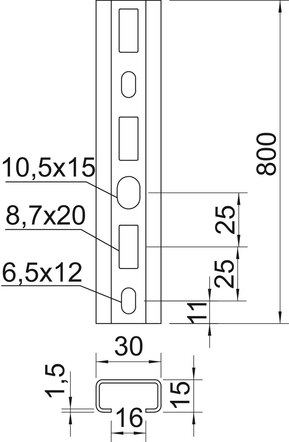 Breakable no CO2 Footprint (GWP) Cradle-to-Gate 1,2973 kg CO2e / 1 Piece Dimension 800x30x15 Dimension L 800 mm Drill hole spacing, centre 25 mm Height 15 mm Length 800 mm Maintain electrical functions no Material Steel Material thickness 1,5 mm Profile shape C profile Slot width 16 mm Static value A 0,8 cm² Static value ly 0,24 cm⁴ Static value lz 1,22 cm⁴ Static value Wy 0,29 cm³ Static value Wz 0,81 cm³ Surface Hot-dip galvanised Type of perforation Perforated back Version for Single profile Width 30 mm With perforation yes With toothing no - All types