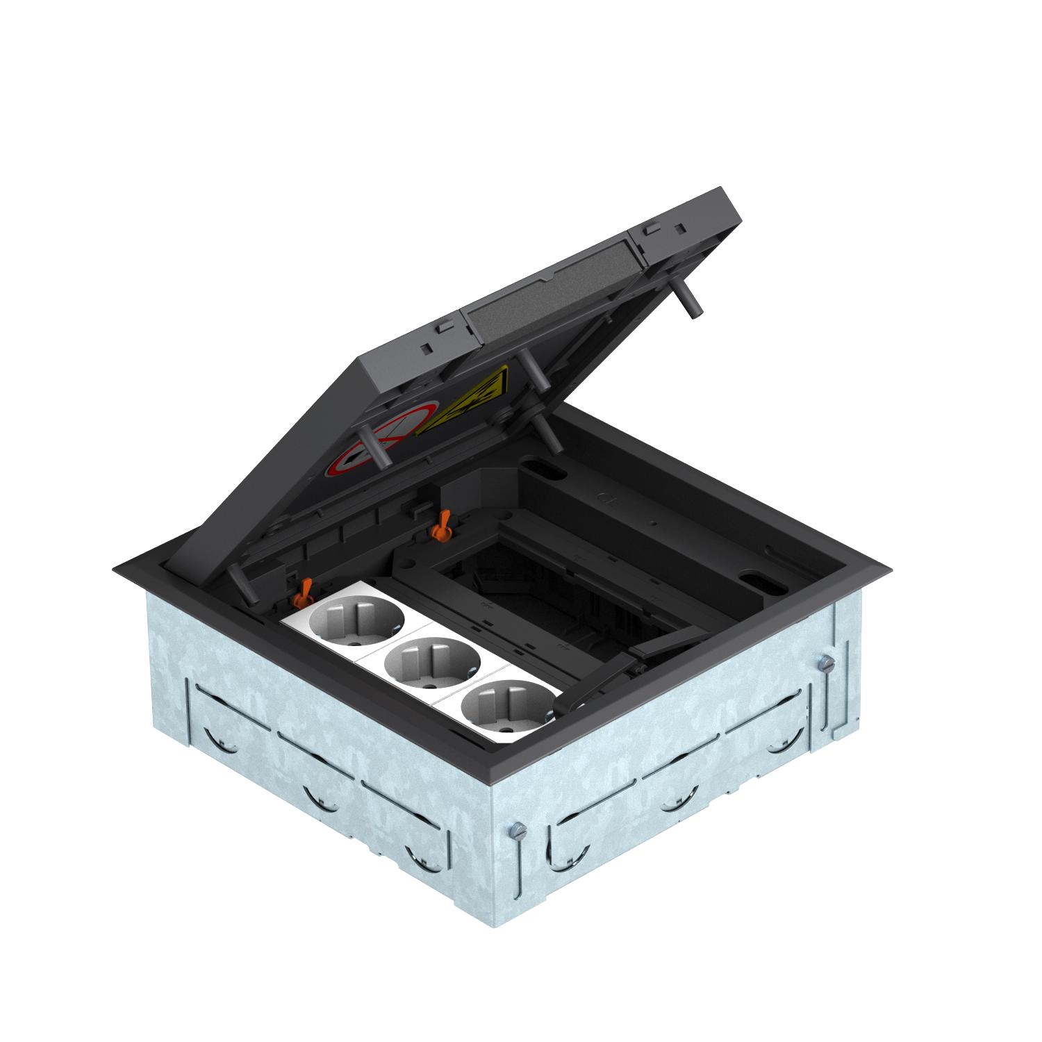 Product descriptionSquare installation unit for six Modul 45 installation devices, for use in dry-care cavity floors and screed floors for indoor use, consisting of an installation housing, GES4-2 service outlet, two UT universal supports and a triple 33° protective contact socket, in white. Installation housing with pre-marked insertion openings for pipelines (M25), adjustable to top edge of screed. In the as-delivered state, the installation housing is closed with a blanking lid. After screed work, the service outlet can be inserted in the created mounting opening. 3, 5, 8 or 10 mm floor covering recess in the hinged cover of the service outlet.