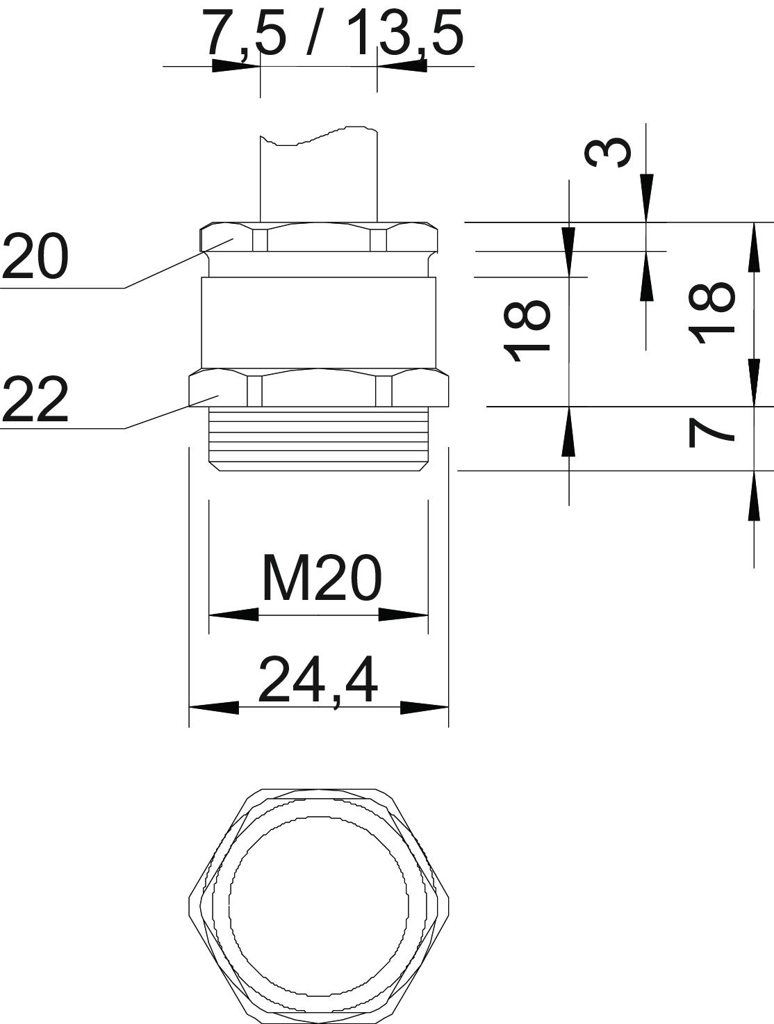 Bend protection no CO2 Footprint (GWP) Cradle-to-Gate 0,0572 kg CO2e / 1 Piece Dimension M20 Dimension E 24,4 mm Dimension L 18 mm Dimension L max. 18 mm Dimension L1 7 mm Dimension L2 18 mm Dimension L3 3 mm explosion-proof no Fibre-glass reinforced no Flat cable gland no For Ex zone Without Halogen-free no Impact-resistant no Material Brass Protection rating IP65 Sealing area D, max. 13,5 mm Sealing area D, min. 7,5 mm Sealing insert, multiple no Strain relief option no Surface Nickel-plated Thread M20 x 1,5 Thread length 7 mm Thread type Metric Type of seal Cuttable sealing ring WAF 1 22 mm WAF 2 20 mm With locknut no - All types