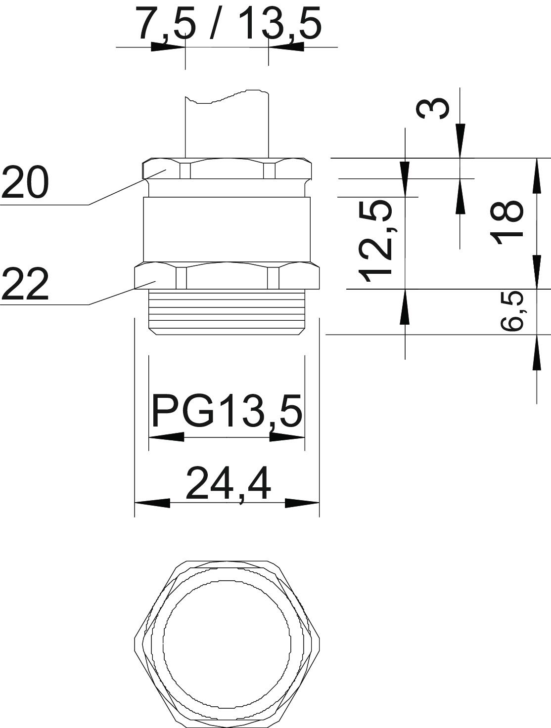 Bend protection no CO2 Footprint (GWP) Cradle-to-Gate 0,0991 kg CO2e / 1 Piece Dimension PG13,5 Dimension E 24,4 mm Dimension L 18 mm Dimension L max. 18 mm Dimension L1 6,5 mm Dimension L2 12,5 mm Dimension L3 3 mm explosion-proof no Fibre-glass reinforced no Flat cable gland no For Ex zone Without Halogen-free no Impact-resistant no Material Brass Protection rating IP54 Sealing area D, max. 13,5 mm Sealing area D, min. 7,5 mm Sealing insert, multiple no Strain relief option no Surface Nickel-plated Thread Pg 13,5 Thread length 6,5 mm Thread type PG Type of seal Cuttable sealing ring WAF 1 22 mm WAF 2 20 mm With locknut no - All types