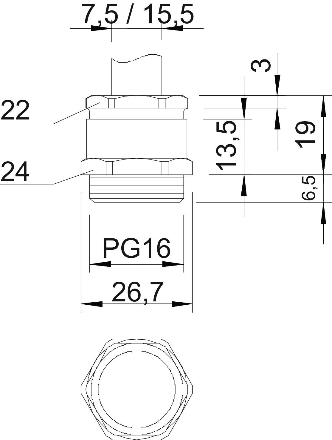 Bend protection no CO2 Footprint (GWP) Cradle-to-Gate 0,0889 kg CO2e / 1 Piece Dimension PG16 Dimension E 26,7 mm Dimension L 19 mm Dimension L max. 19 mm Dimension L1 6,5 mm Dimension L2 13,5 mm Dimension L3 3 mm explosion-proof no Fibre-glass reinforced no Flat cable gland no For Ex zone Without Halogen-free no Impact-resistant no Material Brass Protection rating IP54 Sealing area D, max. 15,5 mm Sealing area D, min. 7,5 mm Sealing insert, multiple no Strain relief option no Surface Nickel-plated Thread Pg 16 Thread length 6,5 mm Thread type PG Type of seal Cuttable sealing ring WAF 1 24 mm WAF 2 22 mm With locknut no - All types