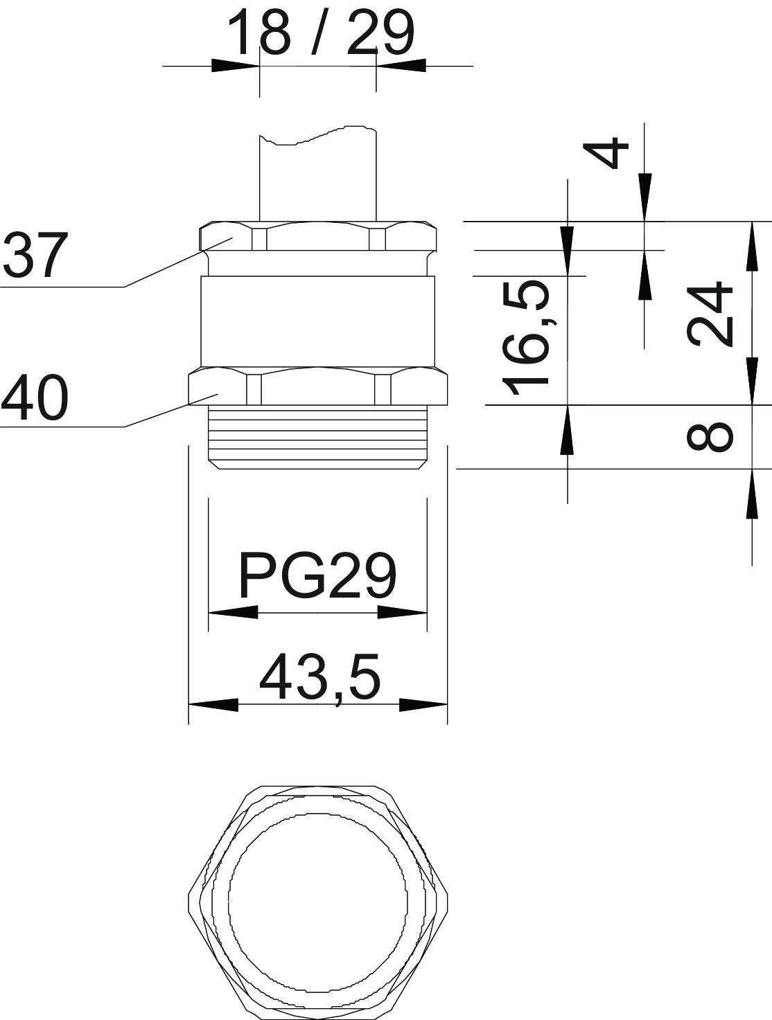 Bend protection no CO2 Footprint (GWP) Cradle-to-Gate 0,2684 kg CO2e / 1 Piece Dimension PG29 Dimension E 43,5 mm Dimension L 24 mm Dimension L max. 24 mm Dimension L1 8 mm Dimension L2 16,5 mm Dimension L3 4 mm explosion-proof no Fibre-glass reinforced no Flat cable gland no For Ex zone Without Halogen-free no Impact-resistant no Material Brass Protection rating IP54 Sealing area D, max. 29 mm Sealing area D, min. 18 mm Sealing insert, multiple no Strain relief option no Surface Nickel-plated Thread Pg 29 Thread length 8 mm Thread type PG Type of seal Cuttable sealing ring WAF 1 40 mm WAF 2 37 mm With locknut no - All types