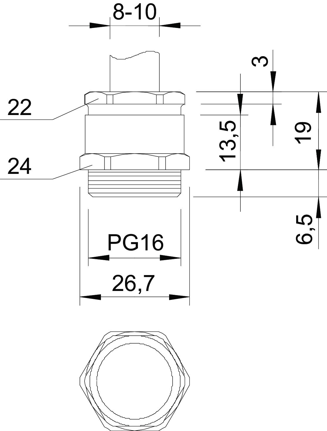 Bend protection no CO2 Footprint (GWP) Cradle-to-Gate 0,0838 kg CO2e / 1 Piece Dimension PG16 Dimension E 26,7 mm Dimension L 19 mm Dimension L max. 19 mm Dimension L1 6,5 mm Dimension L2 13,5 mm Dimension L3 3 mm explosion-proof no Fibre-glass reinforced no Flat cable gland no For Ex zone Without Halogen-free no Impact-resistant no Material Brass Protection rating IP54 Sealing area D, max. 10 mm Sealing area D, min. 8 mm Sealing insert, multiple no Strain relief option no Surface Nickel-plated Thread Pg 16 Thread length 6,5 mm Thread type PG Type of seal Sealing ring WAF 1 24 mm WAF 2 22 mm With locknut no - All types