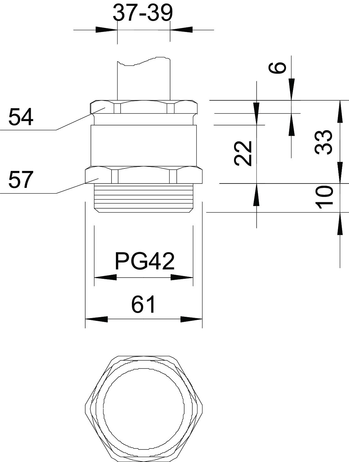 Bend protection no CO2 Footprint (GWP) Cradle-to-Gate 1,0249 kg CO2e / 1 Piece Dimension PG42 Dimension E 61 mm Dimension L 33 mm Dimension L max. 33 mm Dimension L1 10 mm Dimension L2 22 mm Dimension L3 6 mm explosion-proof no Fibre-glass reinforced no Flat cable gland no For Ex zone Without Halogen-free no Impact-resistant no Material Brass Protection rating IP54 Sealing area D, max. 39 mm Sealing area D, min. 37 mm Sealing insert, multiple no Strain relief option no Surface Nickel-plated Thread Pg 42 Thread length 10 mm Thread type PG Type of seal Sealing ring WAF 1 57 mm WAF 2 54 mm With locknut no - All types