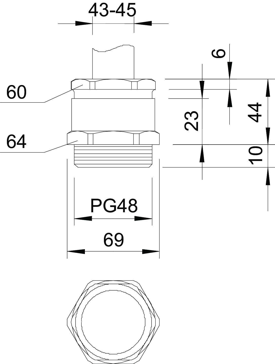 Bend protection no CO2 Footprint (GWP) Cradle-to-Gate 0,7932 kg CO2e / 1 Piece Dimension PG48 Dimension E 69 mm Dimension L 44 mm Dimension L max. 44 mm Dimension L1 10 mm Dimension L2 23 mm Dimension L3 6 mm explosion-proof no Fibre-glass reinforced no Flat cable gland no For Ex zone Without Halogen-free no Impact-resistant no Material Brass Protection rating IP54 Sealing area D, max. 45 mm Sealing area D, min. 43 mm Sealing insert, multiple no Strain relief option no Surface Nickel-plated Thread Pg 48 Thread length 10 mm Thread type PG Type of seal Sealing ring WAF 1 64 mm WAF 2 60 mm With locknut no - All types