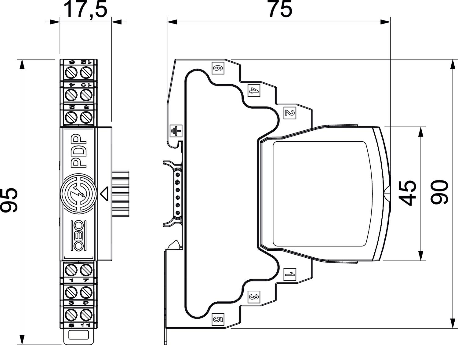 Capacity (wire-earth) ≤30 pF Capacity (wire-wire) ≤30 pF CO2 Footprint (GWP) Cradle-to-Gate 0,7765 kg CO2e / 1 Piece Connection cross-section, flexible, max. 1,5 mm² Connection cross-section, flexible, min. 0,14 mm² Connection cross-section, multi-wire, max. 2,5 mm² Connection cross-section, multi-wire, min. 0,14 mm² Connection cross-section, rigid, max. 2,5 mm² Connection cross-section, rigid, min. 0,14 mm² Cut-off frequency 100 MHz Dimension 48V Earthing via: Connection cable / DIN rail Height 95 mm Impulse durability wire-earth 10 kV / 5 kA Impulse durability wire-wire 10 kV / 5 kA Insertion loss ≤3 dB Kategorie Type 1+2 / D1+C2 Length 75 mm Lengthwise resistance 1.2 ± 5% Lightning impulse current 2,5 kA Lightning protection zone LPZ 0→2 Maximum continuous voltage AC 37 V Maximum continuous voltage DC 52 V Mounting of input / output Screw terminals Nominal discharge current (8/20 µs) 10 kA Nominal load current AC 0,425 A Nominal load current DC 0,6 A Number of poles 4 Permitted temperature range, max. 80 °C Permitted temperature range, min. -40 °C Plug-in system Terminal Protection level wire-earth 850 V Protection level wire-wire 170 V Protection rating IP20 Screening Direct Series resistance per wire 1,2 Ω ± 5% Shielding connection available yes Signalling on device None SPD to EN 61643-11 Type 1+2 SPD to IEC 61643-1 Class I+II SPD to IEC 61643-21 Class I+II / D1+C2 Testing standard IEC 61643-21 Total discharge current (10/350) 5 kA Total discharge current (8/20) 20 kA Total impulse durability into C2 (8/20) 20 kA Version for 2x2-pole Width 17,5 mm - All types