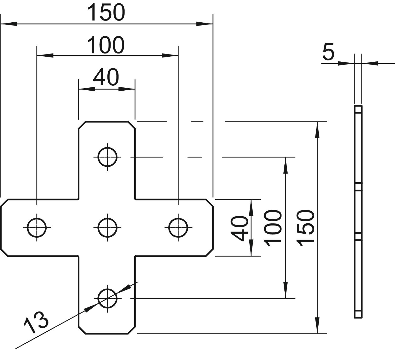 CO2 Footprint (GWP) Cradle-to-Gate 1,5397 kg CO2e / 1 Piece Dimension 150x150x40x5 Height 5 mm Hole size 13 mm Length 150 mm Material Steel Material thickness 5 mm Rustproof steel, pickled no Suitable for profile shapes C profile Surface Hot-dip galvanised Version for With continuous perforation 13 mm Width 40 mm With screw accessories no - All types