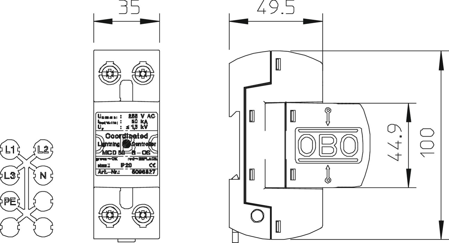 • Lightning current arresting capacity to 50 kA (10/350) per pole and up to 150 kA (10/350) in total
