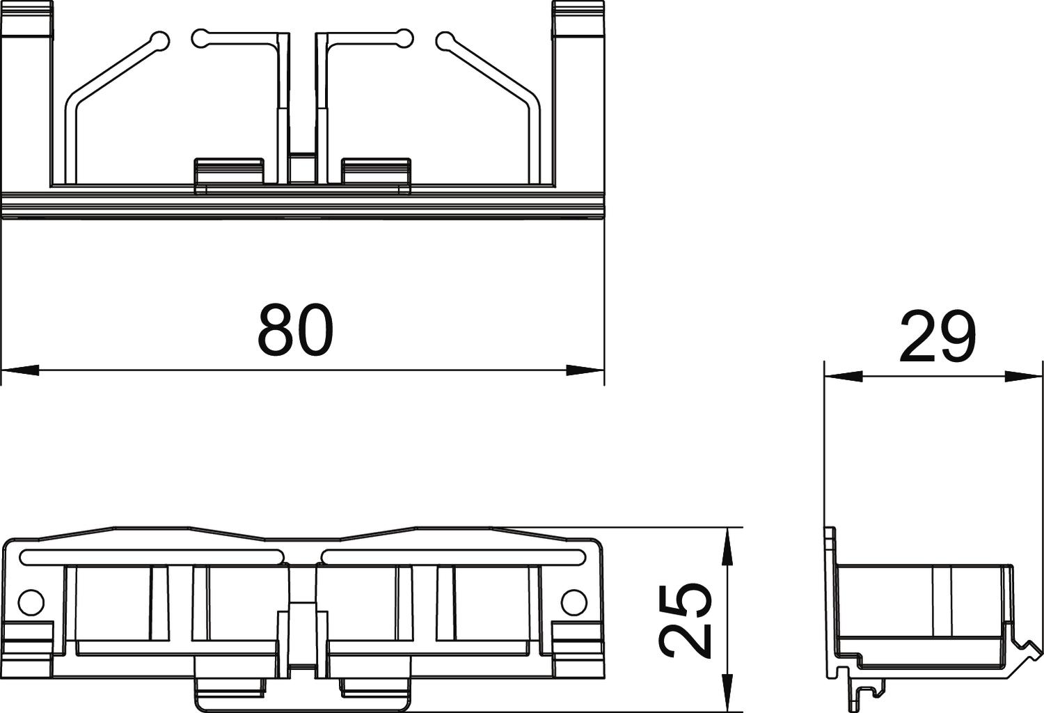 Antibacterial treatment no Ceiling mounting no CO2 Footprint (GWP) Cradle-to-Gate 0,0258 kg CO2e / 1 Piece Colour Graphite black; RAL 9011 Dimension 25x80x29 Height 25 mm Length 29 mm Material Polyamide Width 80 mm With equipotential bonding no - All types
