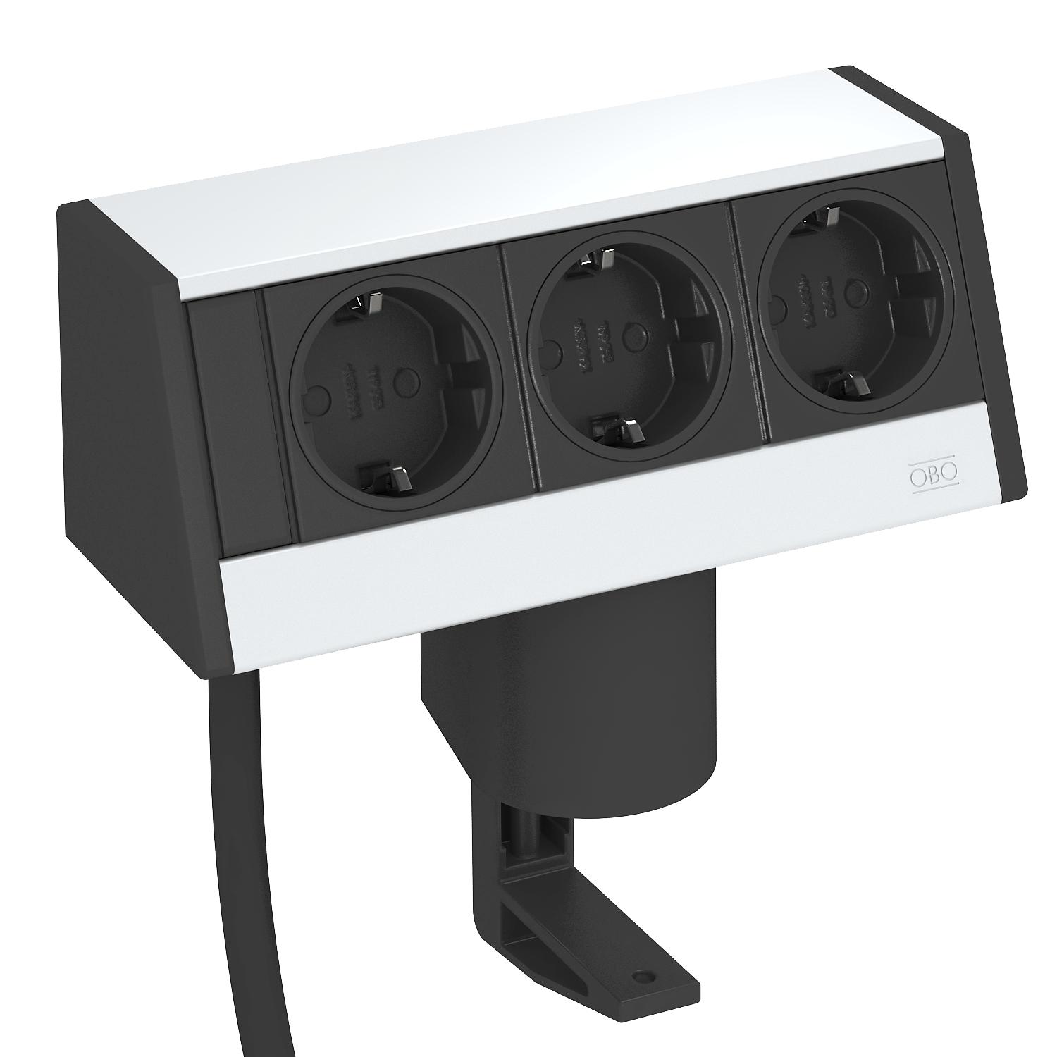 Product descriptionDeskbox with connection cable, cable outlet at the bottom of the profile with a fastening clamp for tabletop thicknesses of 8 to 40 mm.