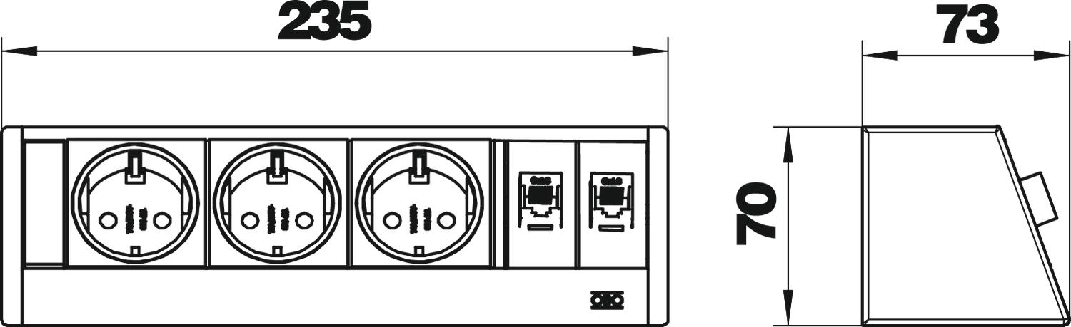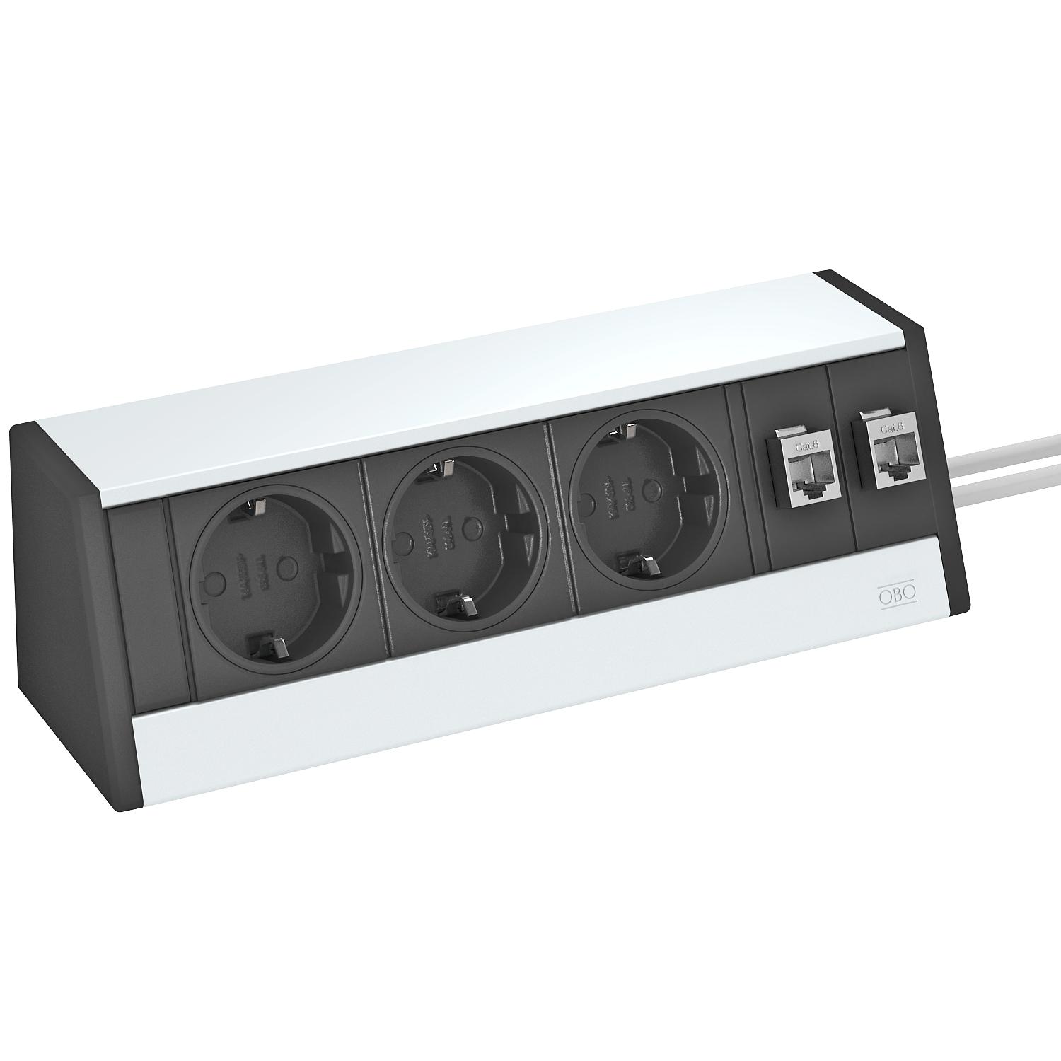 Colour aluminium Extendable no Foldable no Height 70 mm Length 235 mm Length of the supply cable 3 m Material Aluminium Number of CAT 6 connections 2 Number of SCHUKO sockets 3 Surge protection no Version for Housing, silver anodised - All types