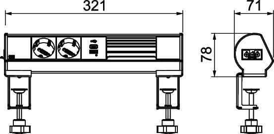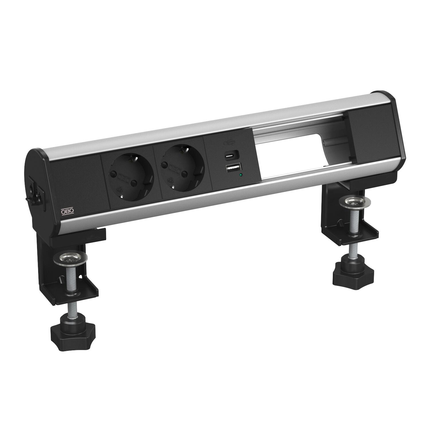 Product descriptionReady-for-connection Deskbox DBL for the direct supply of workstations with power, communications and data technology connections. With a Wieland GST18® connector and cable outlet at the left side of the profile. Toolless mounting with 2 fastening clamps for tabletop thicknesses of 8 to 40 mm and 40 to 70 mm. The Deskbox is equipped with 2 black protective contact sockets in 33° connection direction and a 18W USB A+C Charger. In addition, the Deskbox has space for retroinstallation of 4 communications and data technology Keystone modules (type Modul 45®).
