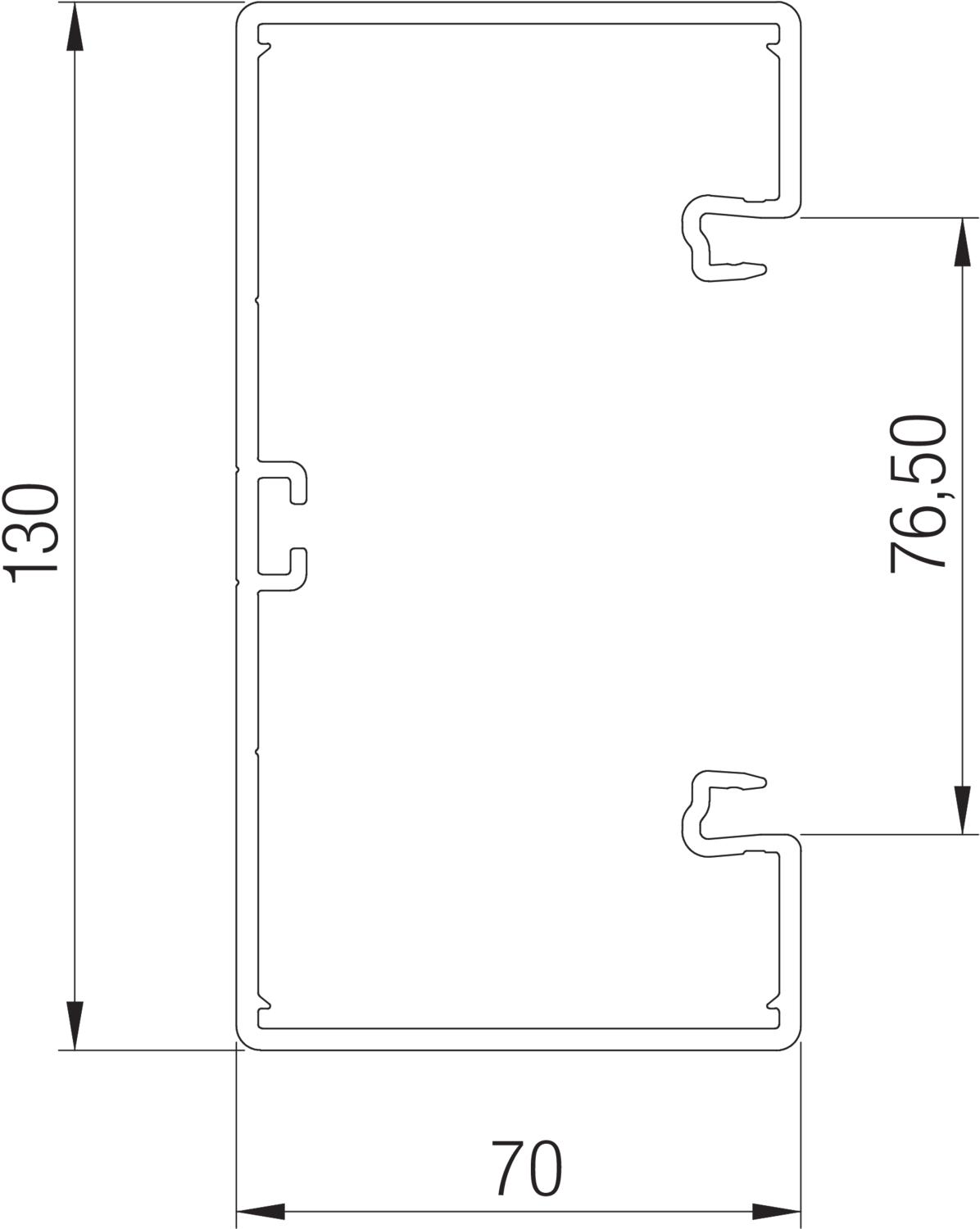 Base perforation With base perforation Cable retaining clip no CO2 Footprint (GWP) Cradle-to-Gate 3,0559 kg CO2e / 1 Meter Colour Jet black; RAL 9005 Cover mounting type Internal Cover supplied no Cover width 76,5 mm Dimension 2000x130x70 Duct connector yes Halogen-free no Height 70 mm Length 2000 mm Material Polyvinylchloride Mounting perforation in base yes Number of covers 1 Number of insertable partitions 1 Permitted temperature range, max. 60 °C Permitted temperature range, min. -5 °C Protective film yes Rear panel version (inner side) Continuous C profile Rectangular shape yes Symmetrical yes Usable cross-section 7600 mm² Width 130 mm - All types